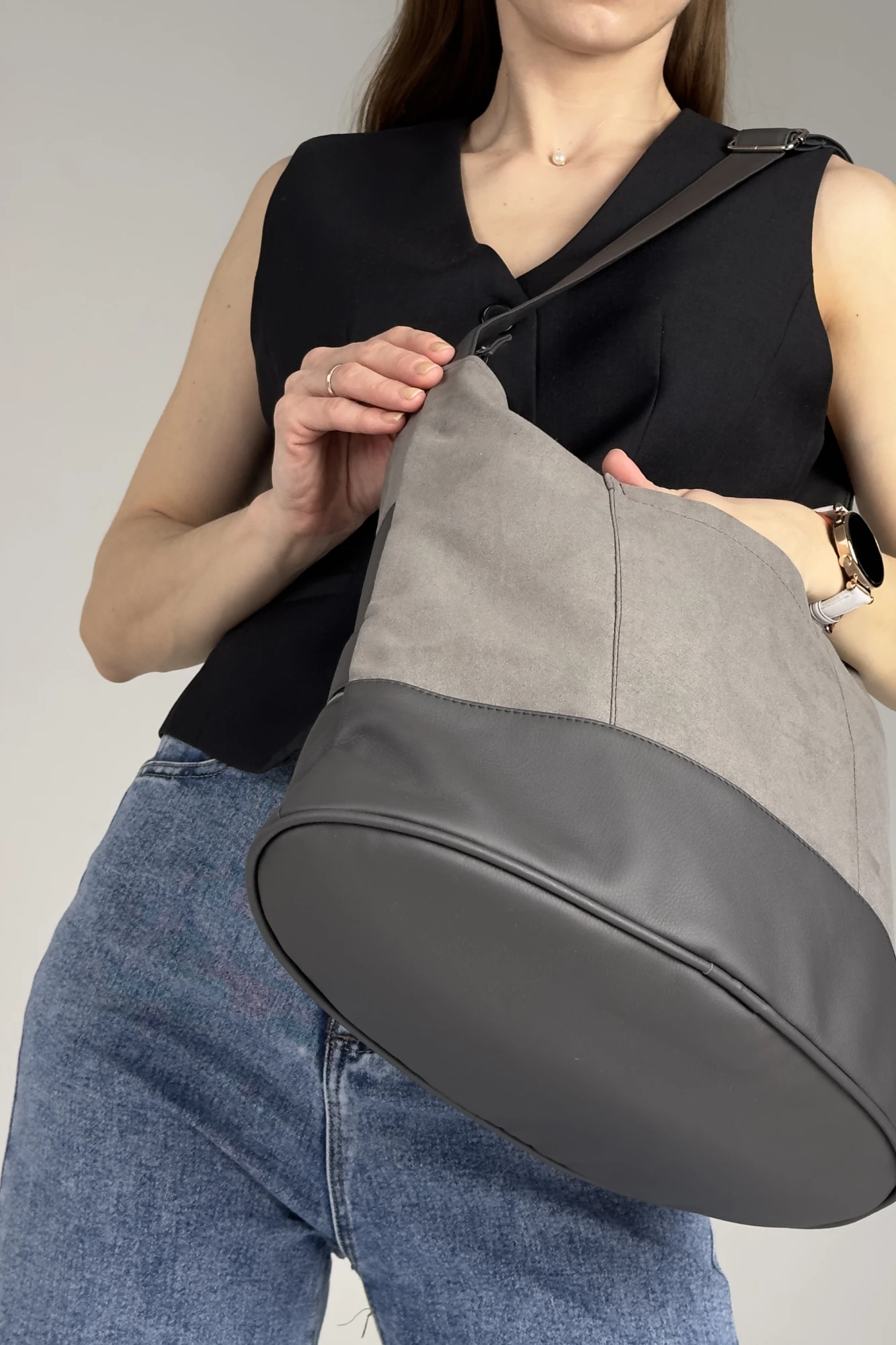 Оригинальная женская сумка среднего размера. Регулируемый ремень можно носить через плечо и на него. Повседневная сумка ведро достаточно вместительная. Внутри небольшой милой модели одно отделение. Также есть внутренние карманы, один из которых на молнии. Модная и красивая молодежная сумка добавит элегантности вашему образу. Объемная небольшая сумка имеет два наружных кармана, которые застегиваются на магнитную кнопку. Дизайнерский женский шоппер на плечо производится из качественной экокожи PU и замши. Материал износостойкий, плотный, держит структуру на протяжении всей эксплуатации. Фактура имитирует рисунок натуральной кожи.