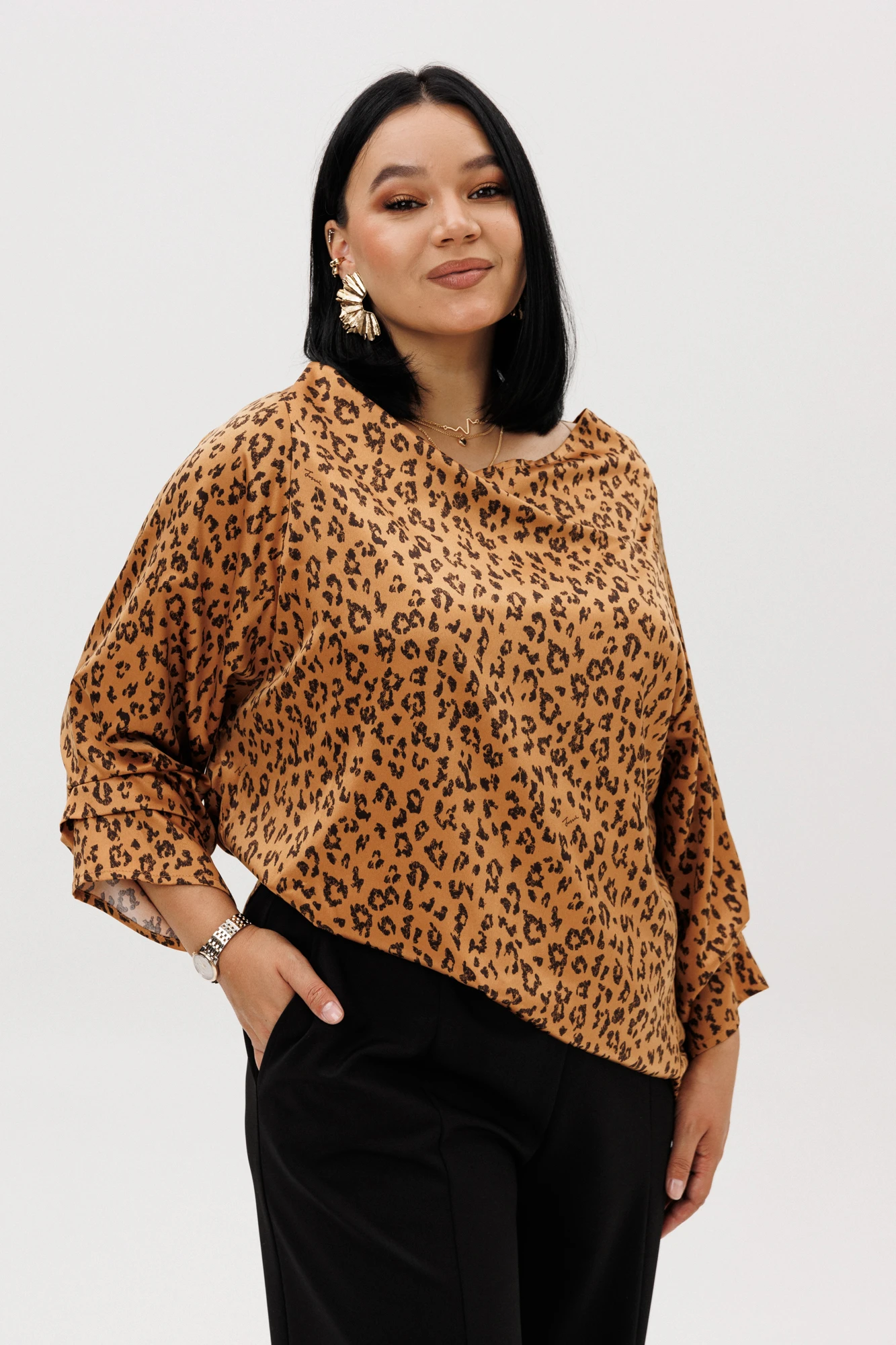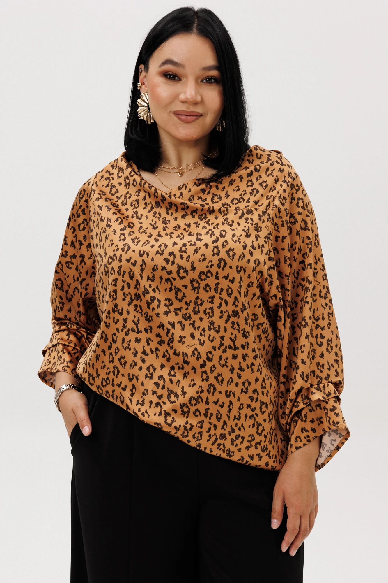 Блузка с анималистичным принтом-это всегда стильно к тому же является трендом этого сезона! Элегантный дизайн блузки от бренда «Anastasia» подарит комфорт и уверенность в себе. Особенности модели: это необычный крой. Модель прямого силуэта, рукав углублённый, рубашечного типа. Перед идет с запахом, низ блузы асимметричный, по полочке углы, спинка закруглённая, удлинённая. По рукаву идут защипы. По горловине нашит металлический логотип бренда. Такой женский офисный стиль можно носить, сочетая с другими вещами гардероба, создавая новые образы. Ткань атласная качественная и очень комфортная. Этот универсальная стильная блузка есть в больших размерах. Она отлично подойдет зимой и летом для офиса, для праздника, на каждый день, для вечеринки и корпоративы, для прогулок, для отдыха, для работы, на выпускной, на день рождения для высоких и для невысоких девушек и женщин. Блузка станет любимой вещью в гардеробе и сделает Ваш образ незабываемым! В «Анастасия» Вы всегда найдете богатый выбор качественной одежды для женщин больших размеров. Длина по спинке: 78 см. Длина рукава: 45 см