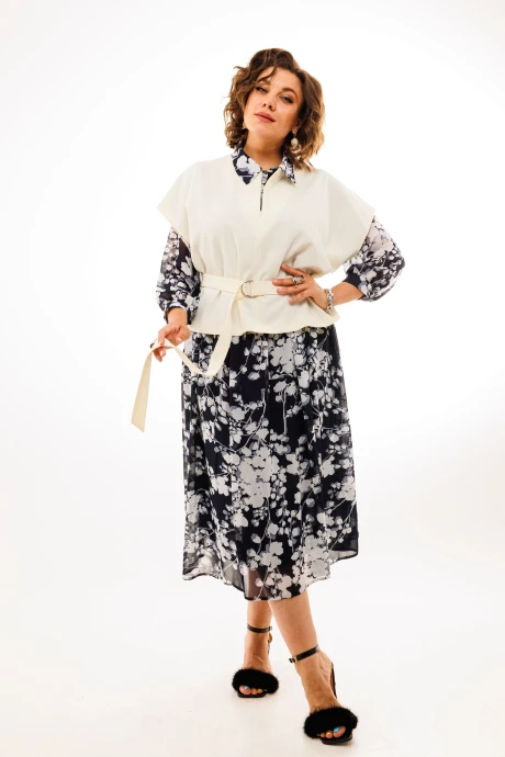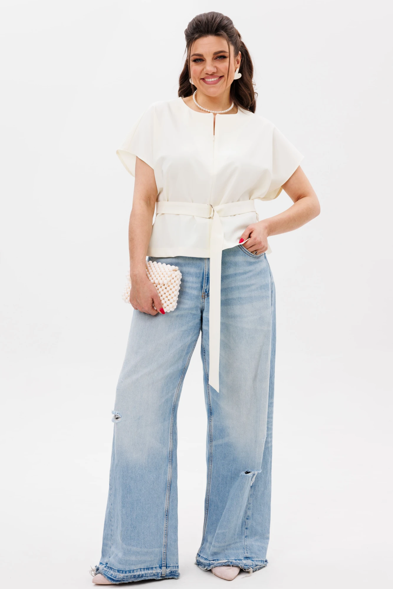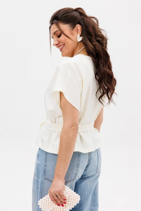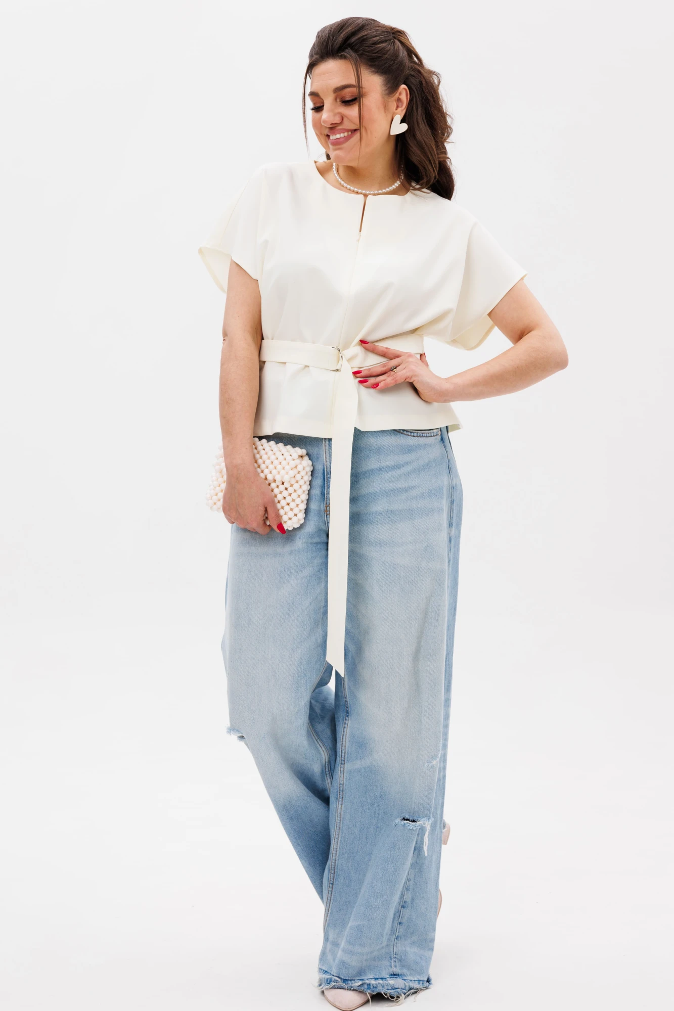 В комплекте с блузой идет пояс, который позволяет подчеркнуть талию и добавить образу женственности. Эта блуза — настоящая находка для создания разнообразных образов: её можно сочетать с брюками, юбками или стилизовать под платье, создавая эффектный и запоминающийся лук.