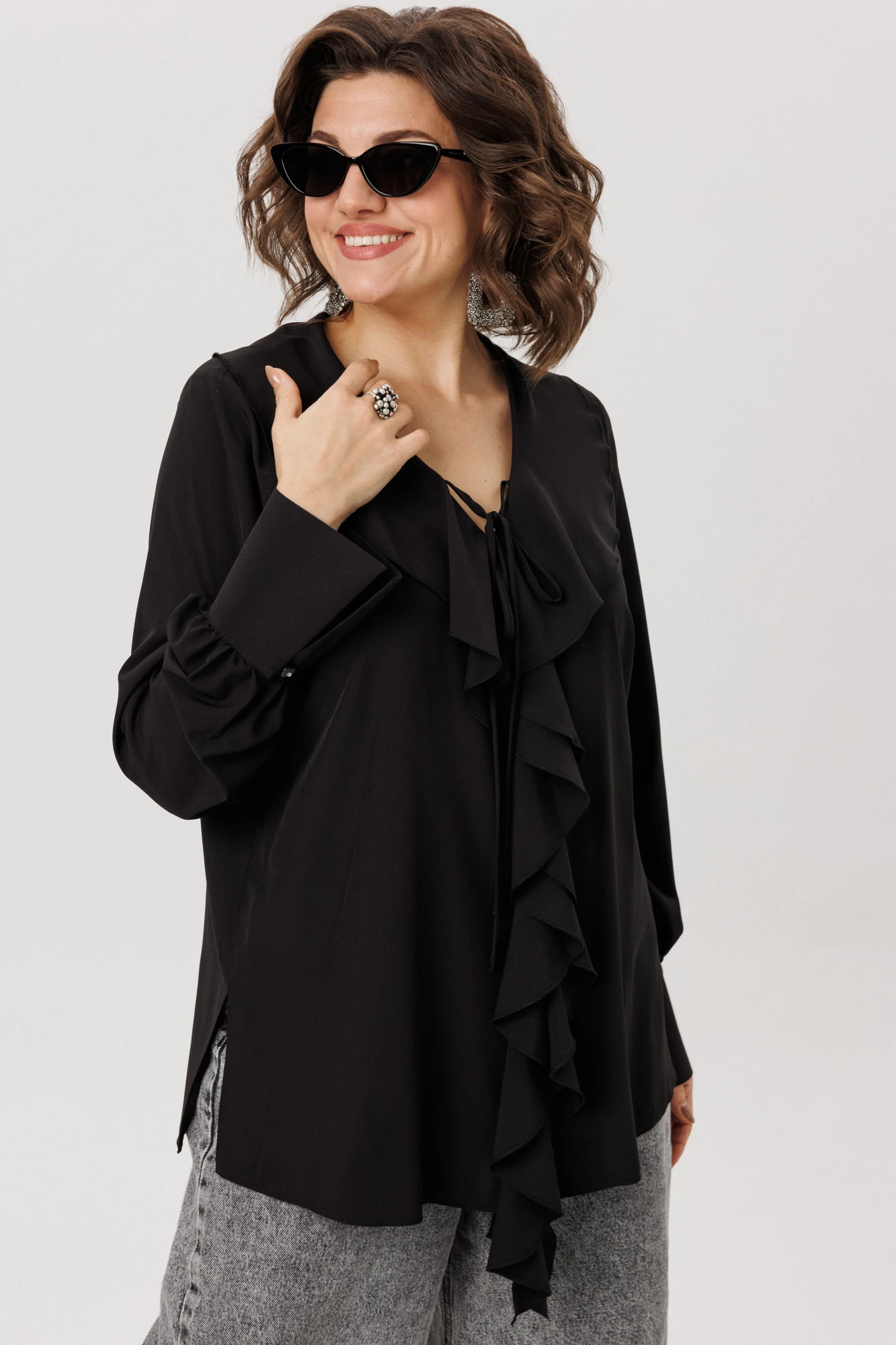 Глубокий V-образный вырез, украшенный воланами, подчеркивает изысканно-романтичный характер блузы. Эту историю дополняет игра завязок: их можно распустить для непринуждённой элегантности или завязать на шее, чтобы подчеркнуть трогательную женственность.