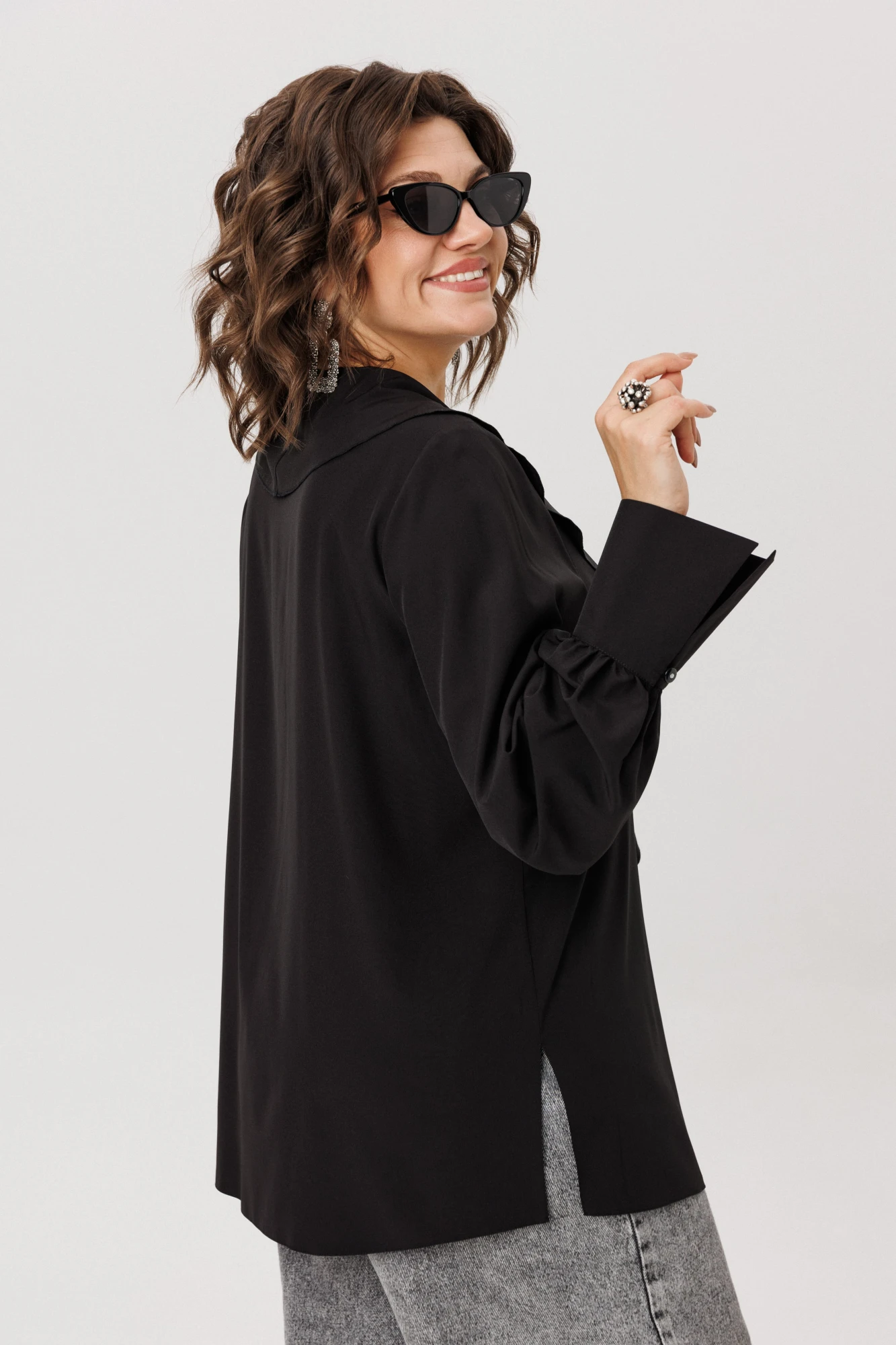 Мягкие сборки на длинных рукавах, переходящие в аккуратные манжеты, и лёгкие разлетающиеся разрезы по бокам завершают картину, делая каждый жест и каждое движение частью изящного и мечтательного стиля.