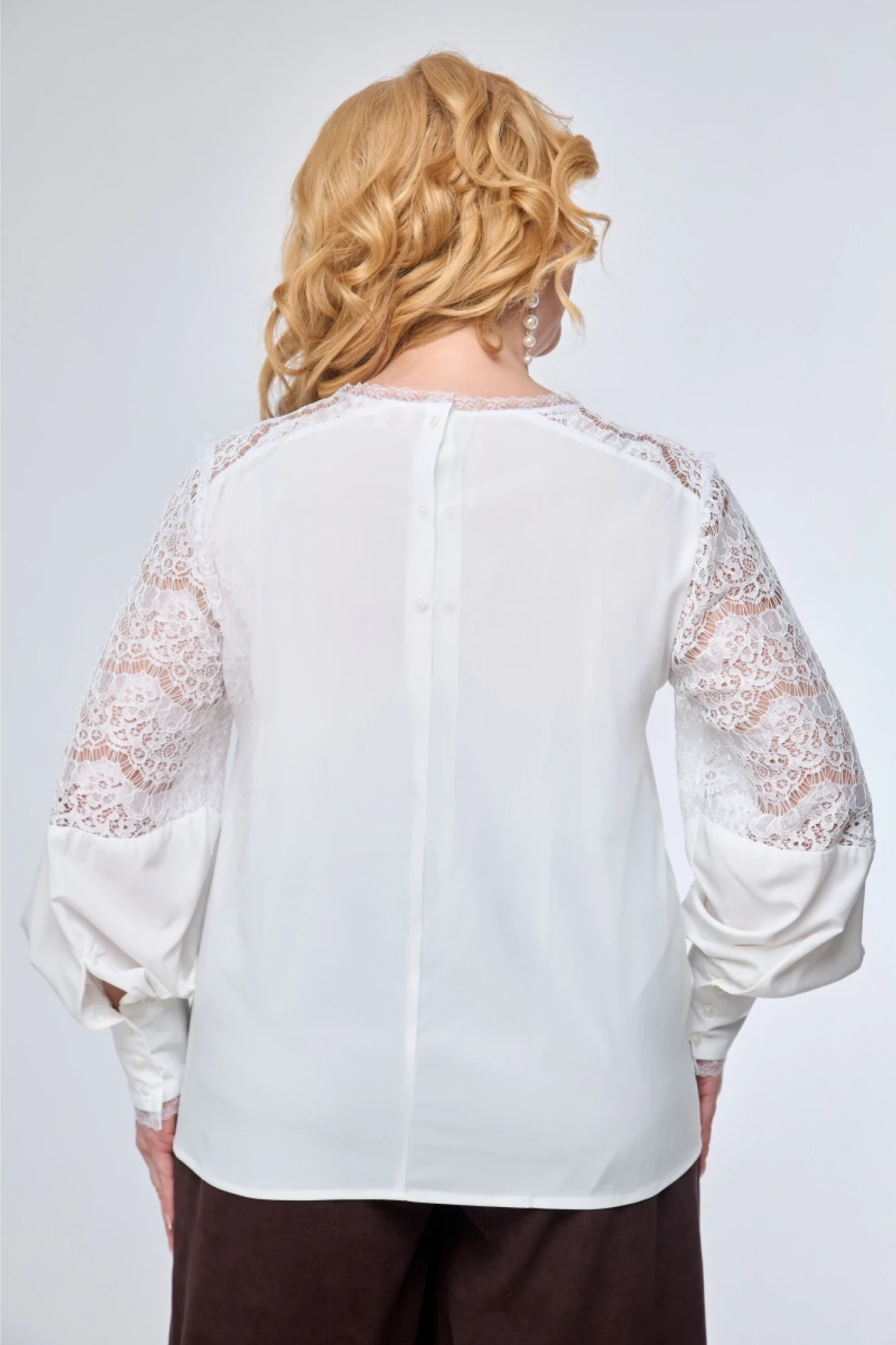 Прямой силуэт. По переду и спинке кружевные кокетки. Втачной рукав на манжете также имеет отделочные детали из тончайшего гипюра с вышивкой. Округлый вырез горловины с отделкой из кружева. Застежка на пуговицы в среднем шве спинке.