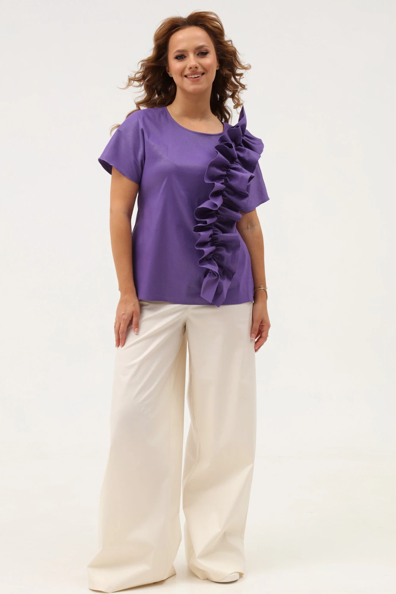 Блузка прямого силуэта. Горловина округлой формы, по спинке с застежкой на навесную петлю и пуговицу. По переду блузки - декоративная рюша. По спинке средний шов. Рукав короткий цельнокроеный."