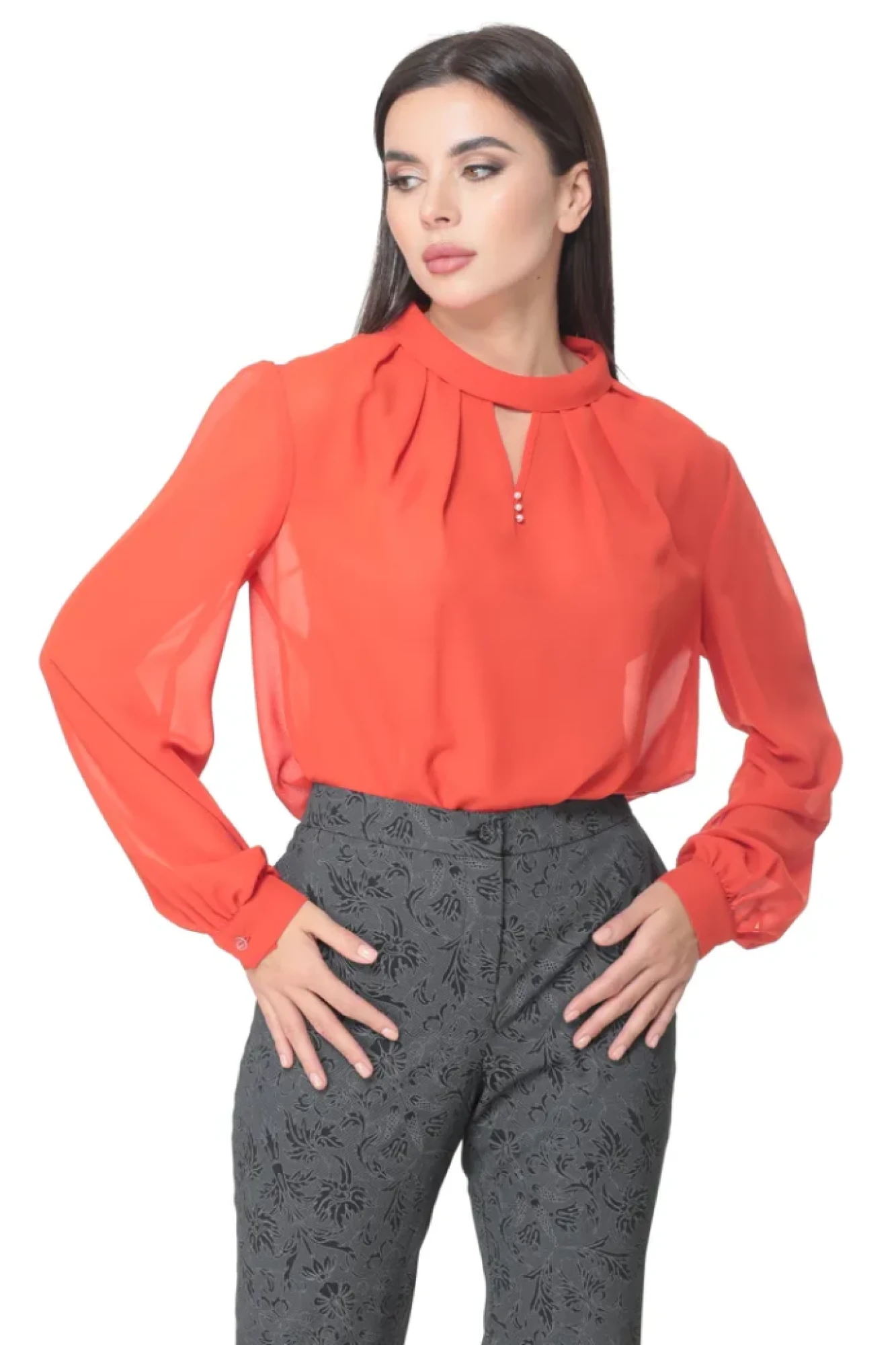 Блузка женская свободного силуэта. В горловине переда блузки расположены мягкие симметричные складки. По центру переда расположена декоративная капелька. Спинка со средним швом, в котором находится застежка на навесную петлю. Горловина обработана отложным воротником-стойкой. Рукав прямой, длинный, одношовный. Низ рукава со сборкой и манжетой с застежкой на одну петлю-пуговицу. На фото с блузой представлены брюки М-478 Длина блузы по спинке 63 см