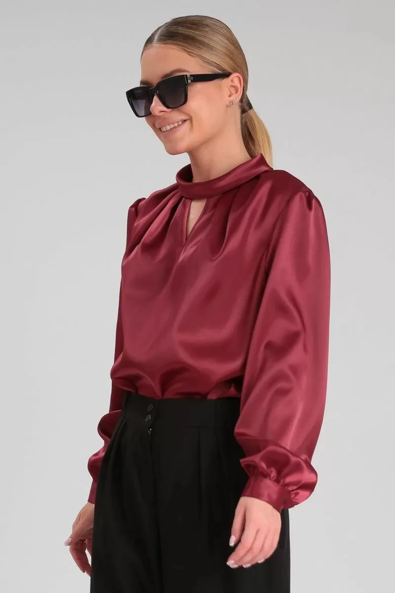 "Женская блузка из гладкой однотонной ткани с атласной структурой украсит вас на любом праздничном или официальном мероприятии. Такая блузка будет прекрасно сочетаться со строгими брюками и юбкой любого фасона.