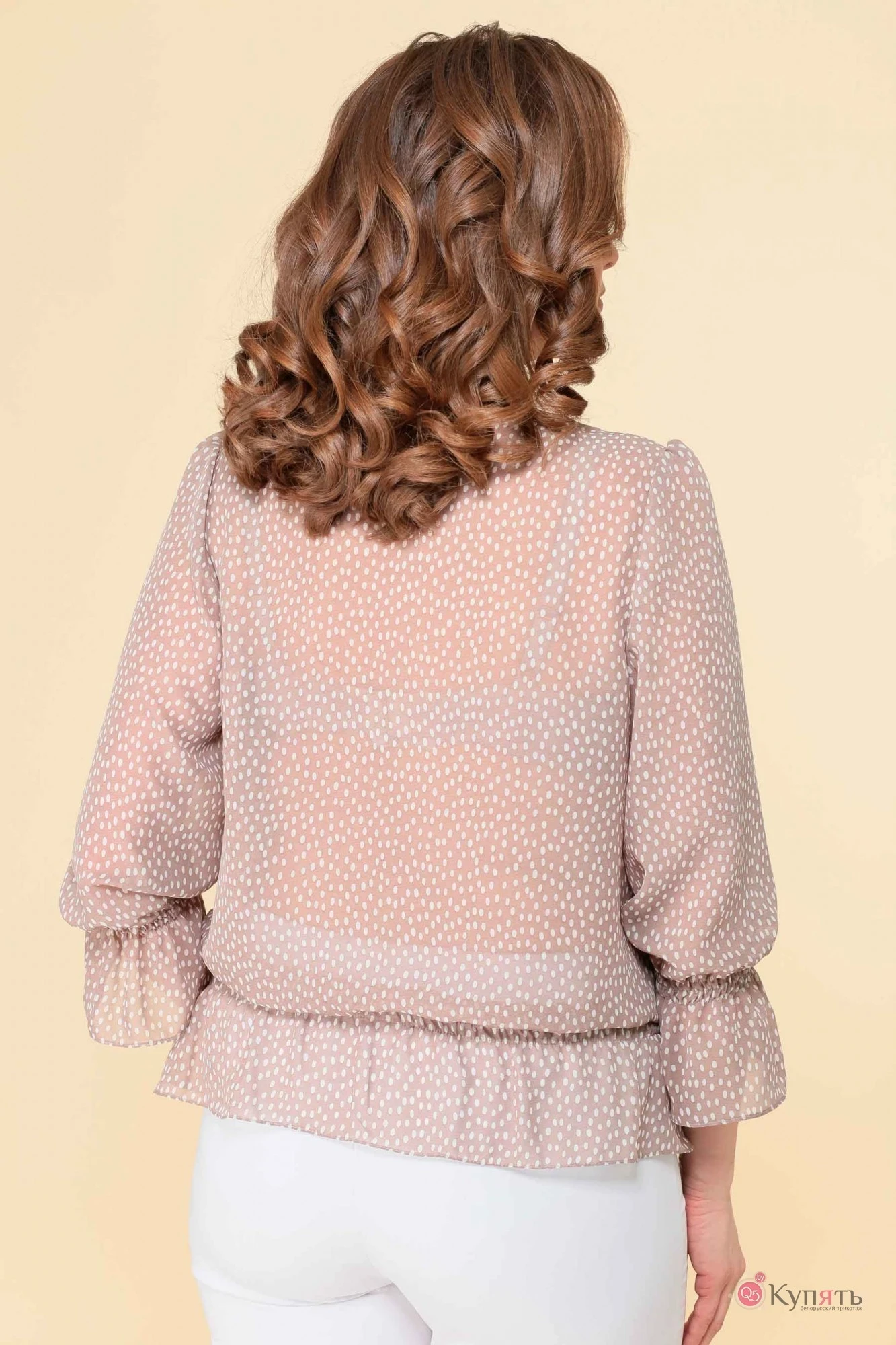 Блузка женская свободного силуэта, из шифона в горошек ткани. Горловина с присборенной стойкой на завязку. Рукав три четверти, присборенный по низу на резинки. Перед с нагрудными вытачки. Спинка свободная. Низ блузки присборен на резинки.