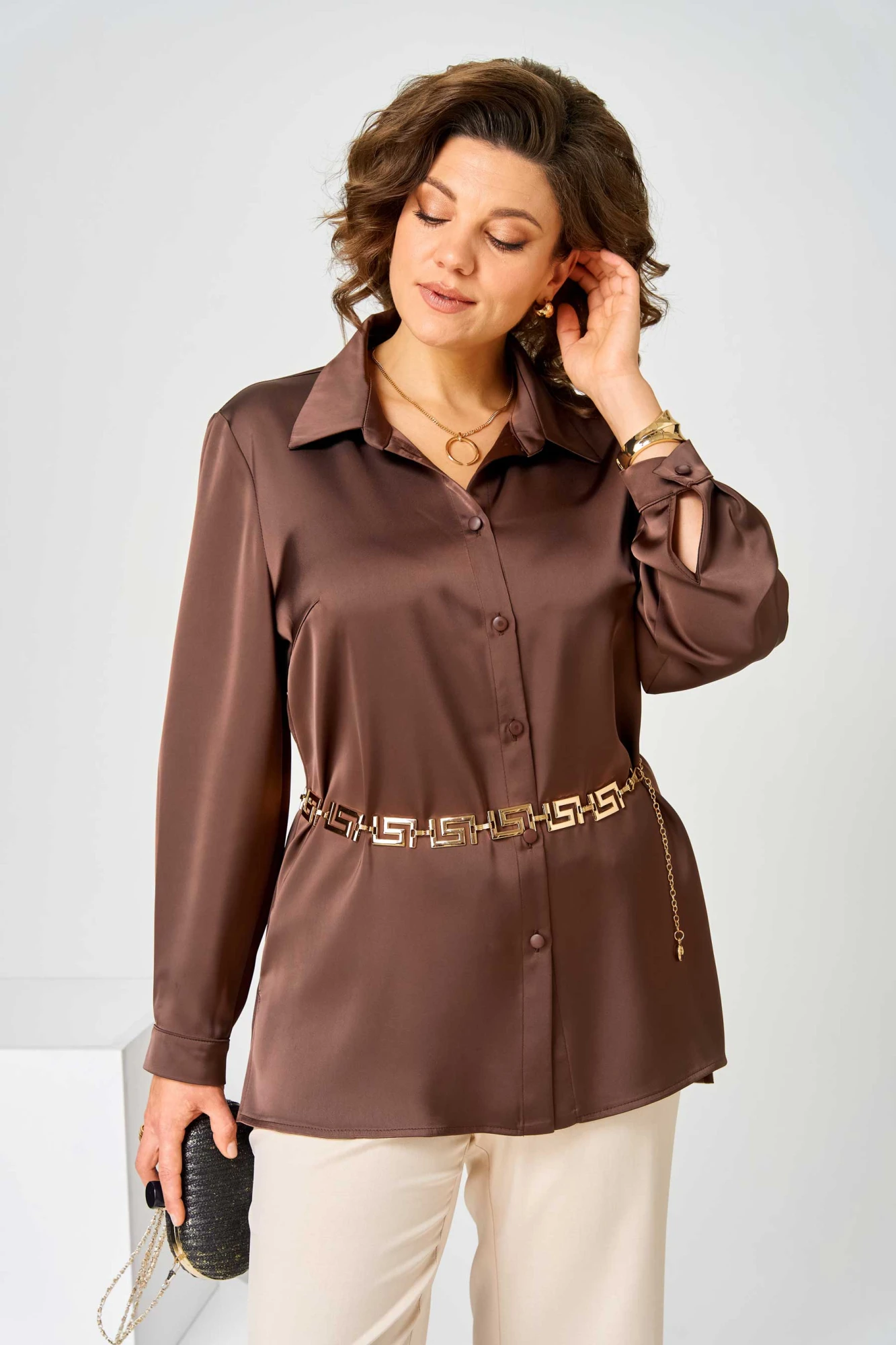 Блузка из атласной ткани с длинным рукавом и манжетом. Воротник мужской на стойке. Перед с нагрудными вытачками и центральной застежкой на пуговицы. Спинка свободная.