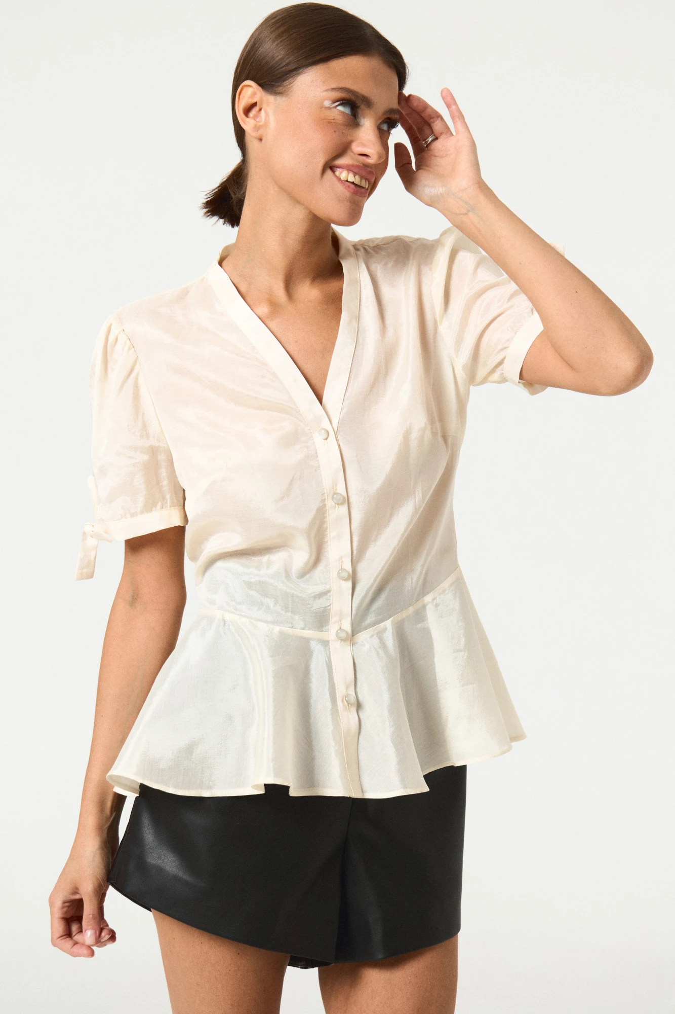 Женская блузка прилегающего силуэта, с центральной застежкой, с баской и коротким рукавом. Перед с нагрудными вытачками из бокового шва. Спинка без среднего шва, с талиевыми вытачками. Рукава длиной до середины плеча, со сборкой по окату, с притачной манжетой. Застежка по притачной планке борта на пуговицы.
