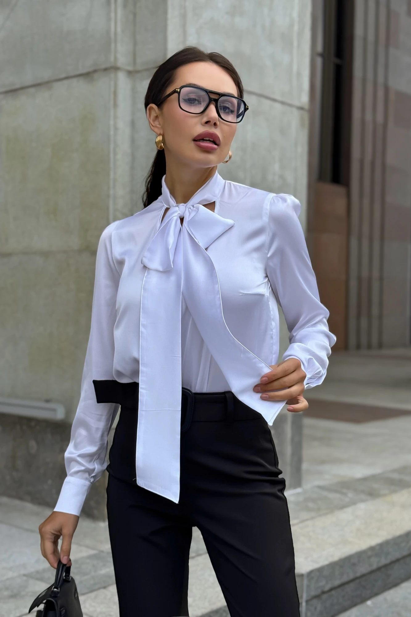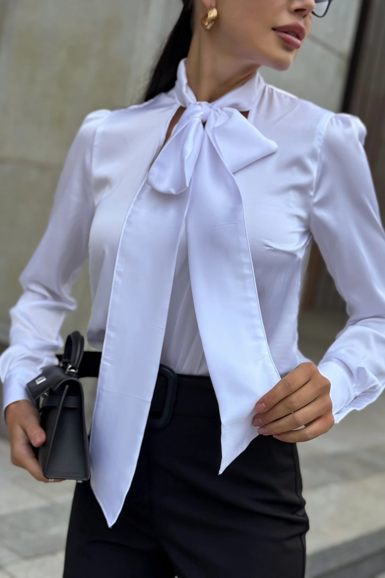 Блуза классическая, выполнена из синтетичского шелка. Рукав втачно ношовный, обработан манжетой из основной ткани. Лиф изделия обработан притачны бантом