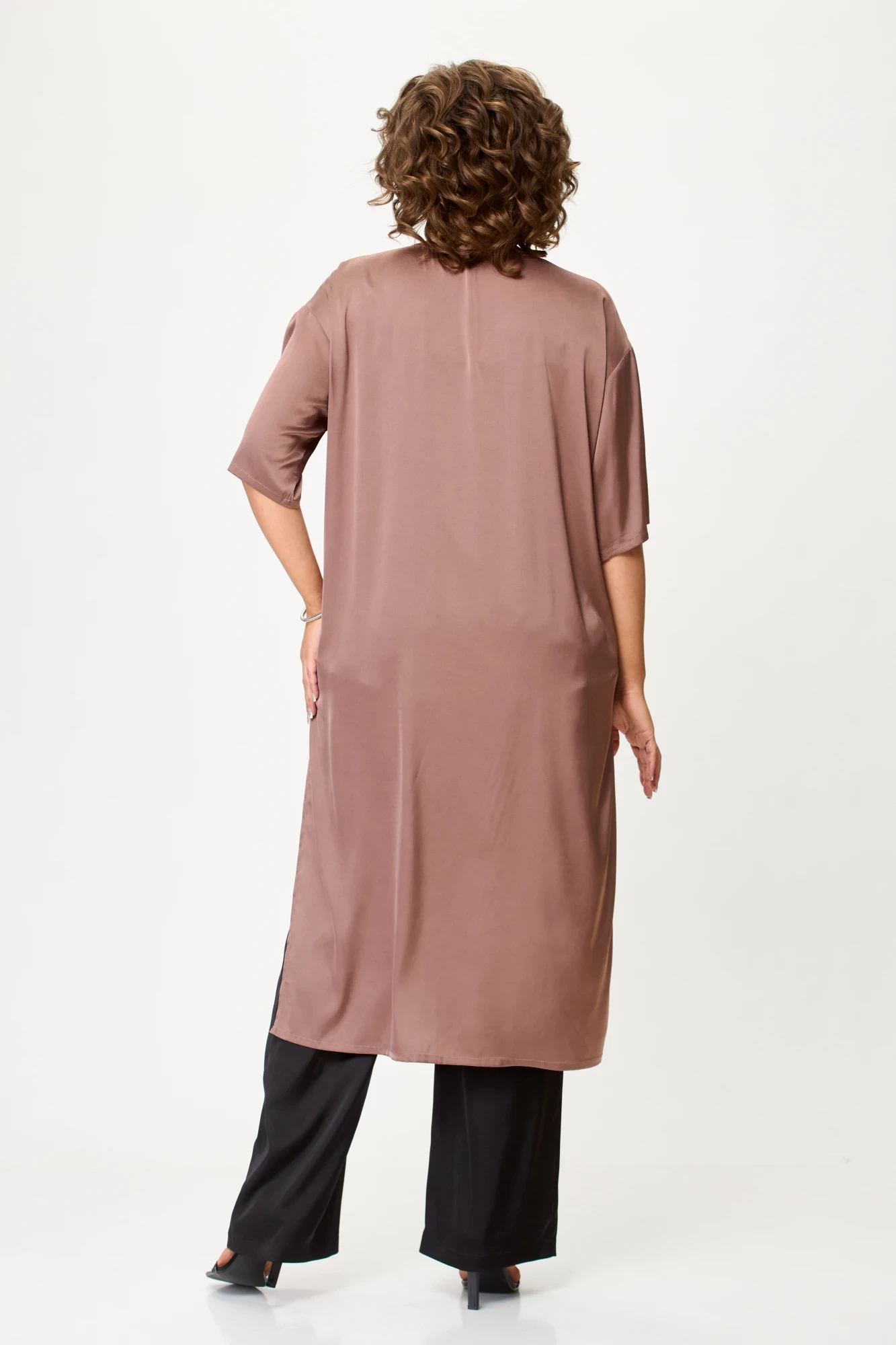 Рубашка свободного силуэта, прямого кроя, удлиненная. Край борта обработан закрытым срезом. По краю борта чуть ниже груди 2 навесные встречные петли и пуговицы. Спущенная линия плеча, рукав короткий, низ рукава обработан закрытым срезом. По бокам разрезы. Длина плеча-21см, длина рукава-25.5см, длина по спинке-118,5см. Длина разреза 53.5см. Ткань шелк.