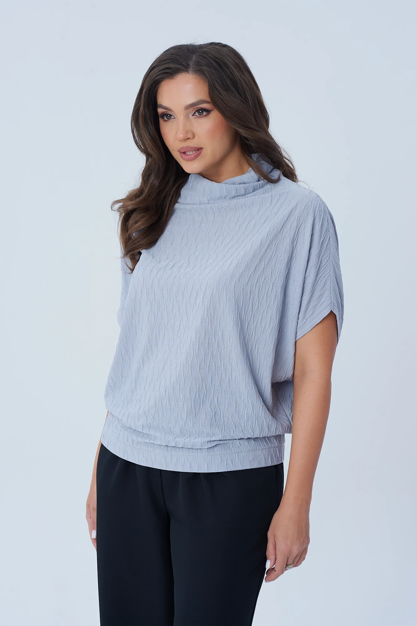 Необычная блуза свободного силуэта со свободным спущенным плечом, коротким рукавом типа «летучая мышь» и цельнокроеным воротником стойкой. Выполнена из приятного к телу текстурного материала. Это изделие можно носить как самостоятельно, так и под базовую рубашку, гольф. Блузка выгодно скрывает недостатки и подчеркивает достоинства, подойдет девушкам с любым типом фигуры. Разнообразить образ также можно с помощью различных ярких аксессуаров.