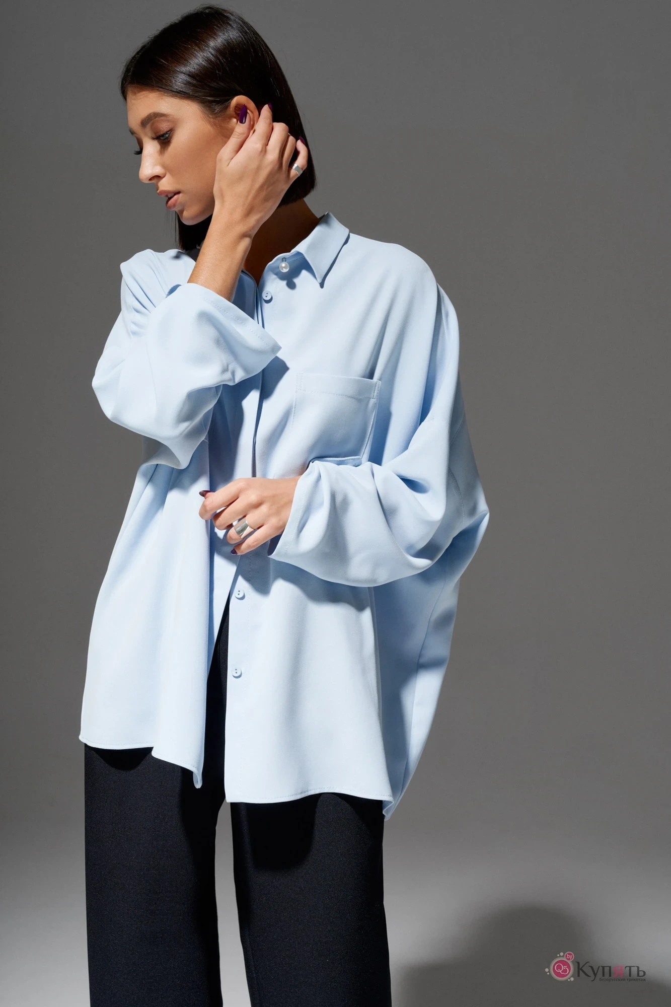 Рубашка женская прямого кроя. Воротник рубашечного типа. Застежка по переду на скрытые под планкой пуговицы. Спинка отрезная. Рукав без манжета, с пуговичкой - бусинкой по середине рукава и скрытым элементом для удержания рукава при сборке. В боковых швах разрезы. По переду нашиты карманы.