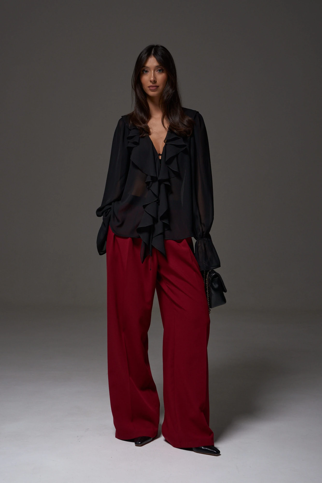Блузка из текстильного прозрачного полотна черного цвета. Характеристика: свободный крой, горловина V-образная, с притачной рюшей по всей длине горловины и борта, застежка на шнурки-завязки, рукав втачной, притачной манжетой в виде волана. Длина рукава 74 см. Длина по спинке 62 см.