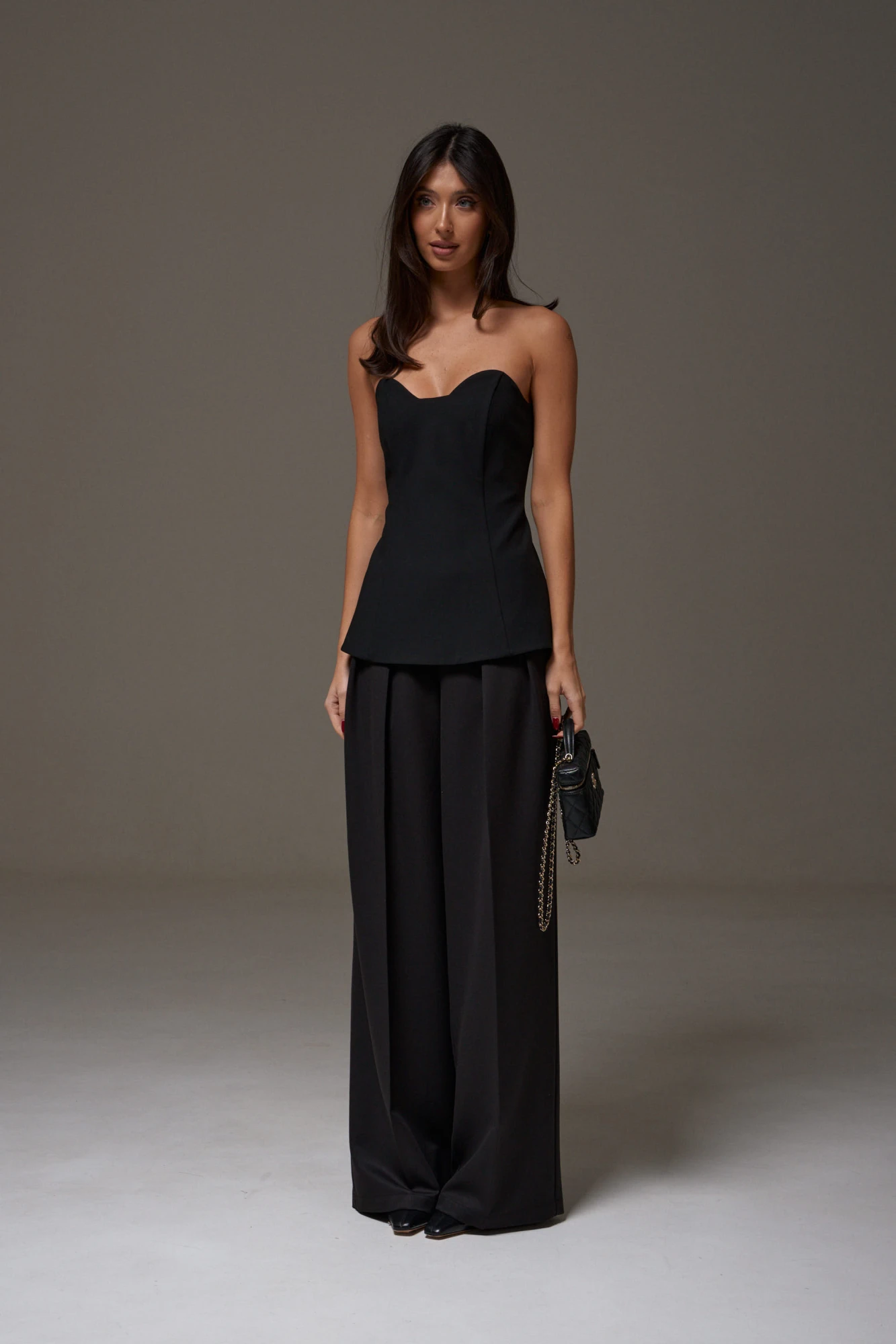Блузон с фигурным вырезом выполнен из костюмного полотна черного цвета. Характеристики: прилегающий силуэт, подкладка, фигурный вырез горловины, по передней части изделия и в боковых швах упругие узкие пластины, по заднему полотну в среднем шве потайная молния. Длина по центру спинки 41см.