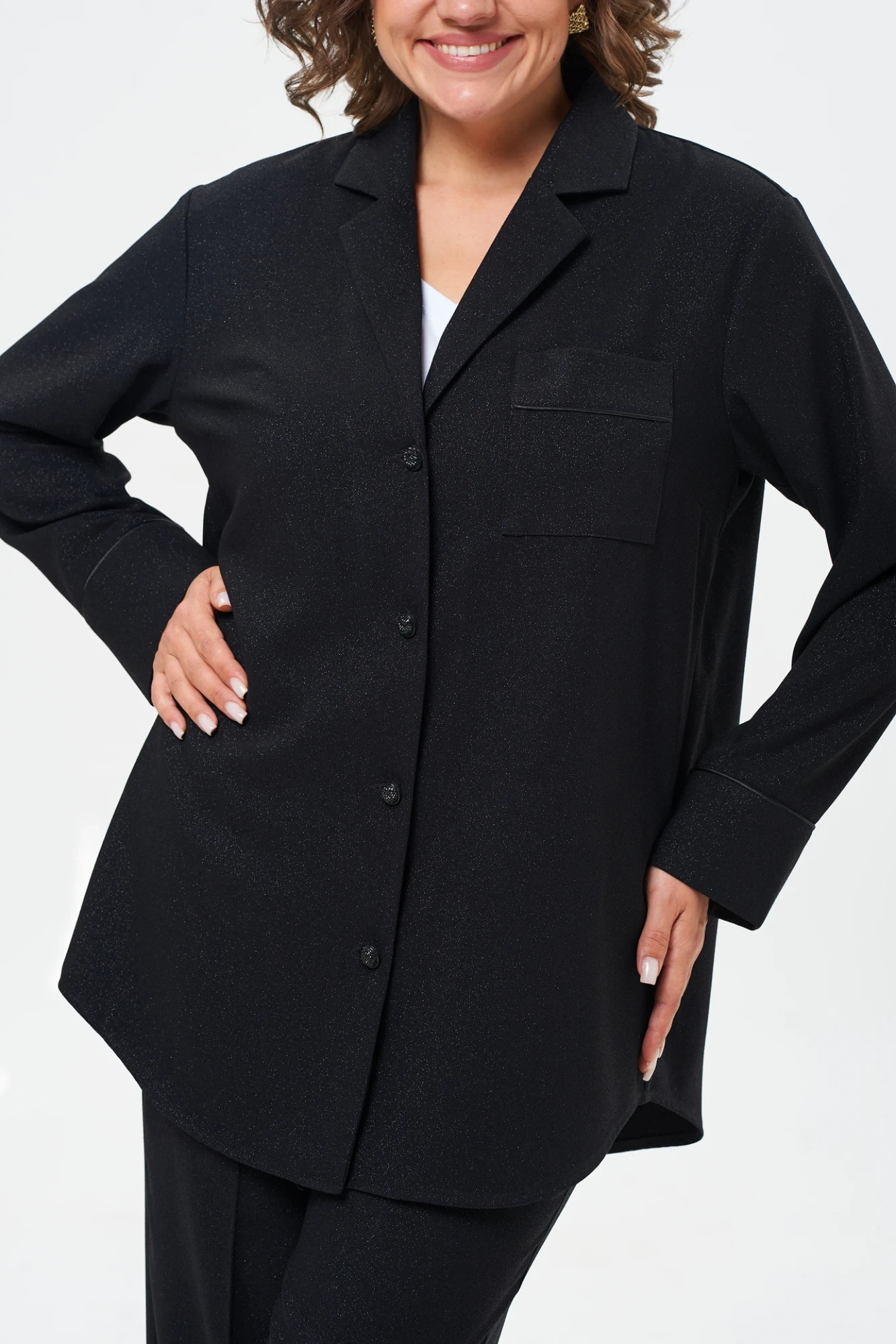 Блуза женская, нарядная, из текстильной ткани с умеренным блеском, свободного силуэта, воротник пиджачного типа, рукав втачной, по низу манжета. По переду блузку имеются нагрудные вытачки, по спинке кокетка и складка, низ фигурный. Длина по спинке 81 см, длина рукава 58 см.