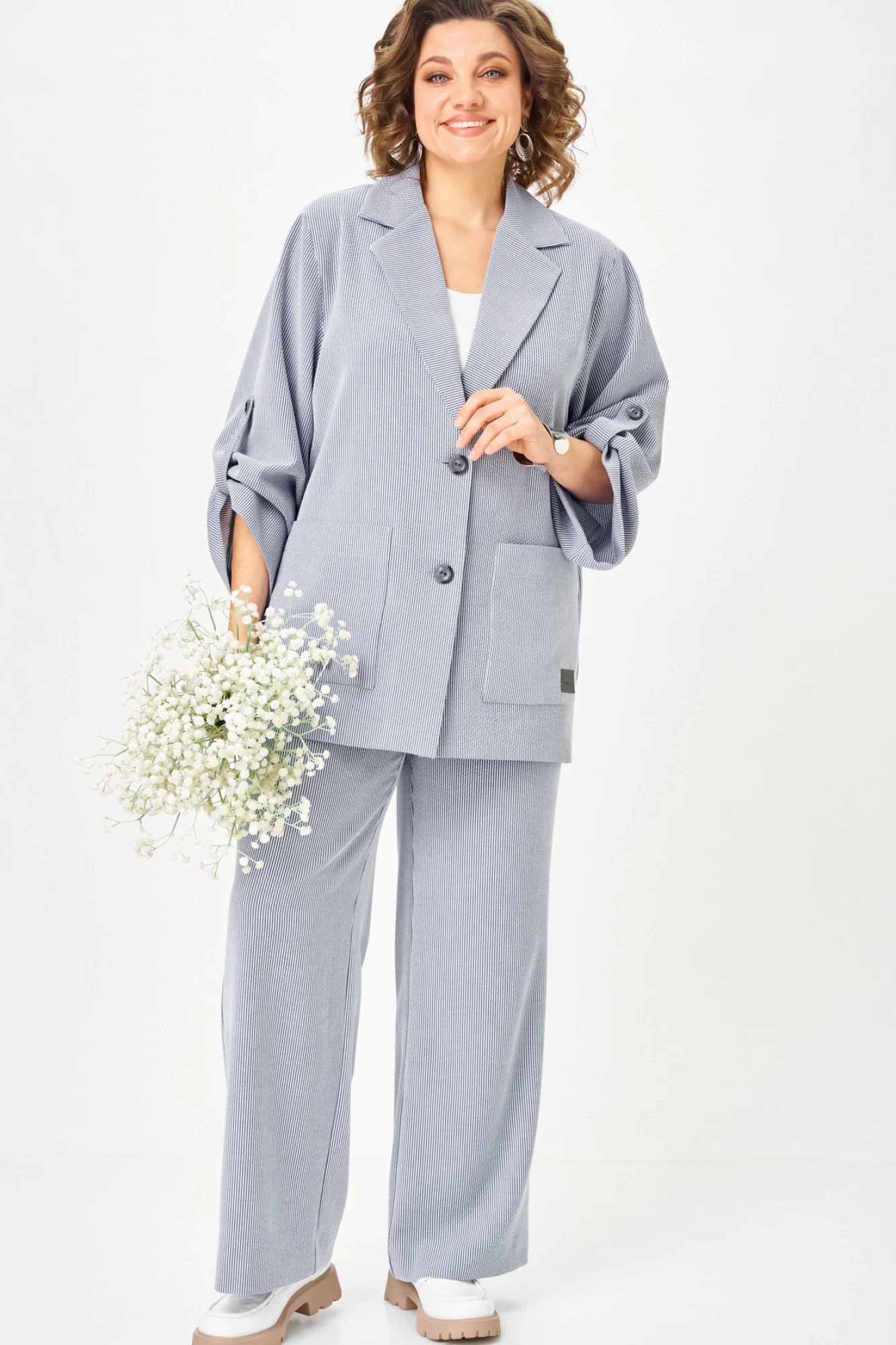 Костюм женский, 2-х предметный, состоит из жакета и  брюк. Этот комплект сбалансированный ансамбль для современной деловой женщины. Мы объединили две вещи, которые составляют основу стильного и практичного гардероба. Жакет свободного силуэта, оверсайз. Рукав подворачивается хлястиком, отложной воротник и настрочные карманы делают жакет завершенным и комфортным в носке. Центральная застежка на петли-пуговицы. Спинка цельная, жакет без подкладки. Брюки-палаццо, средней ширины, выполнены с карманами с отрезным бочком в боковом шве. Пояс притачной, застёжка на молнию. По задним половинкам обработаны вытачки, и в области боковых вставлена резинка. Длина жакета по спинке 75 см, дли на брюк по боковому 105 см.