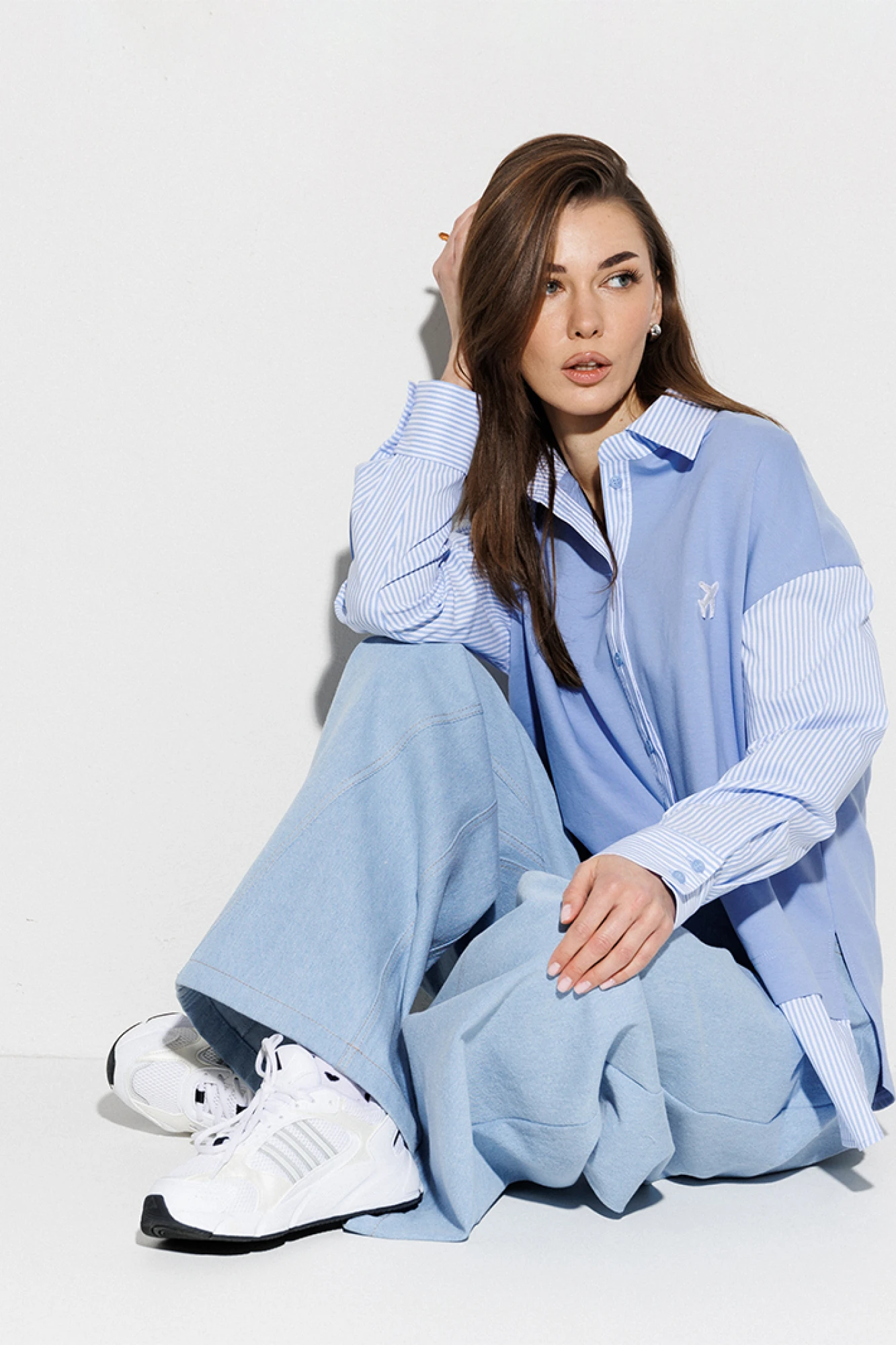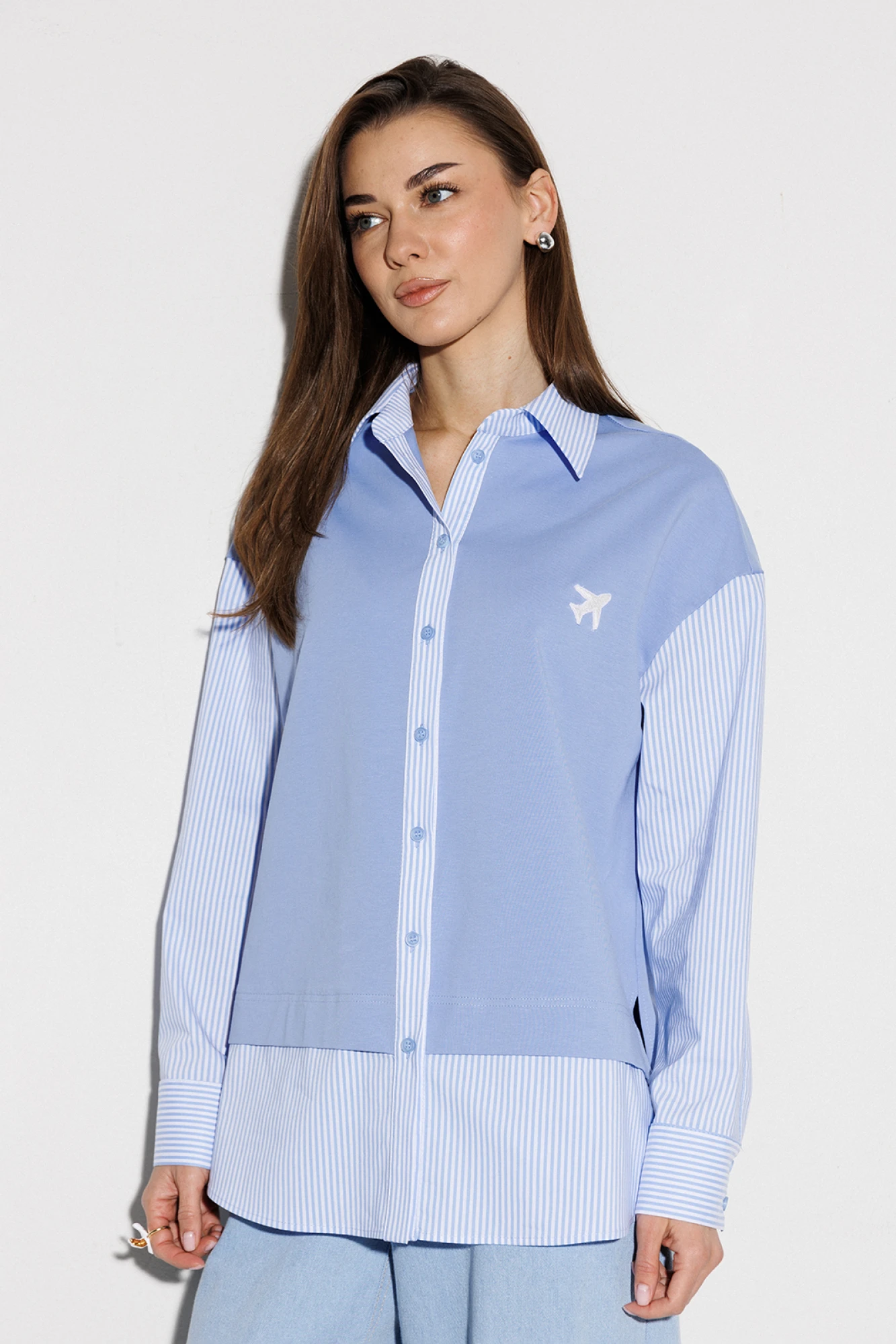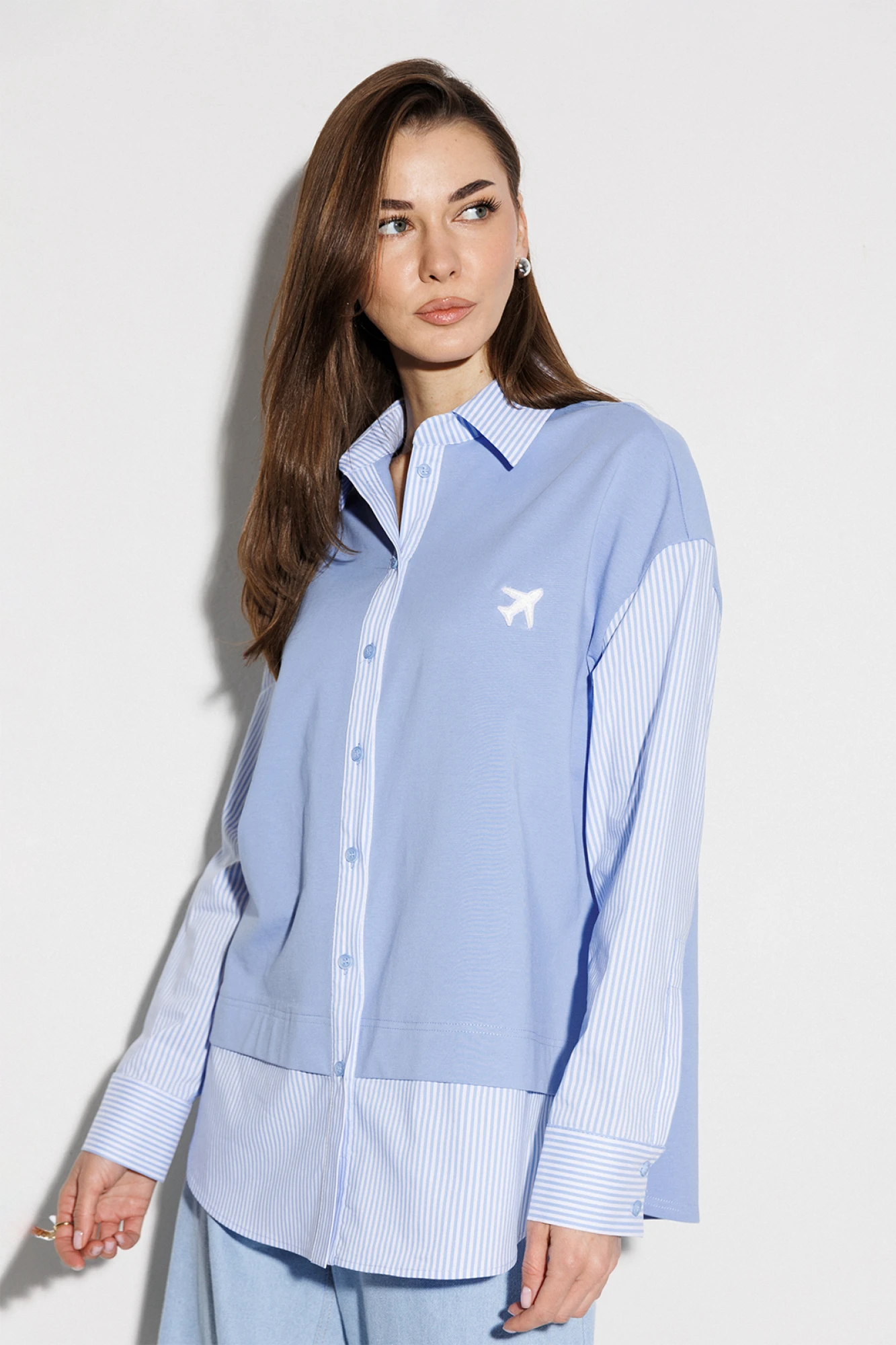 Блузка, комбинированная прямого силуэта, с втачным одношовным рукавом, со складкой и манжетой, с застежкой на петли-пуговицы и спущенной линией плеча. Полочка из трикотажа и рубашечной ткани с центральной застежкой на петли-пуговицы и вышивкой "Самолет". Спинка из трикотажа с печатью "BUTER". Воротник рубашечный отложной на стойке. Спинка и полочка с фигурным низом. Внизу по боковым швам обработаны разрезы.