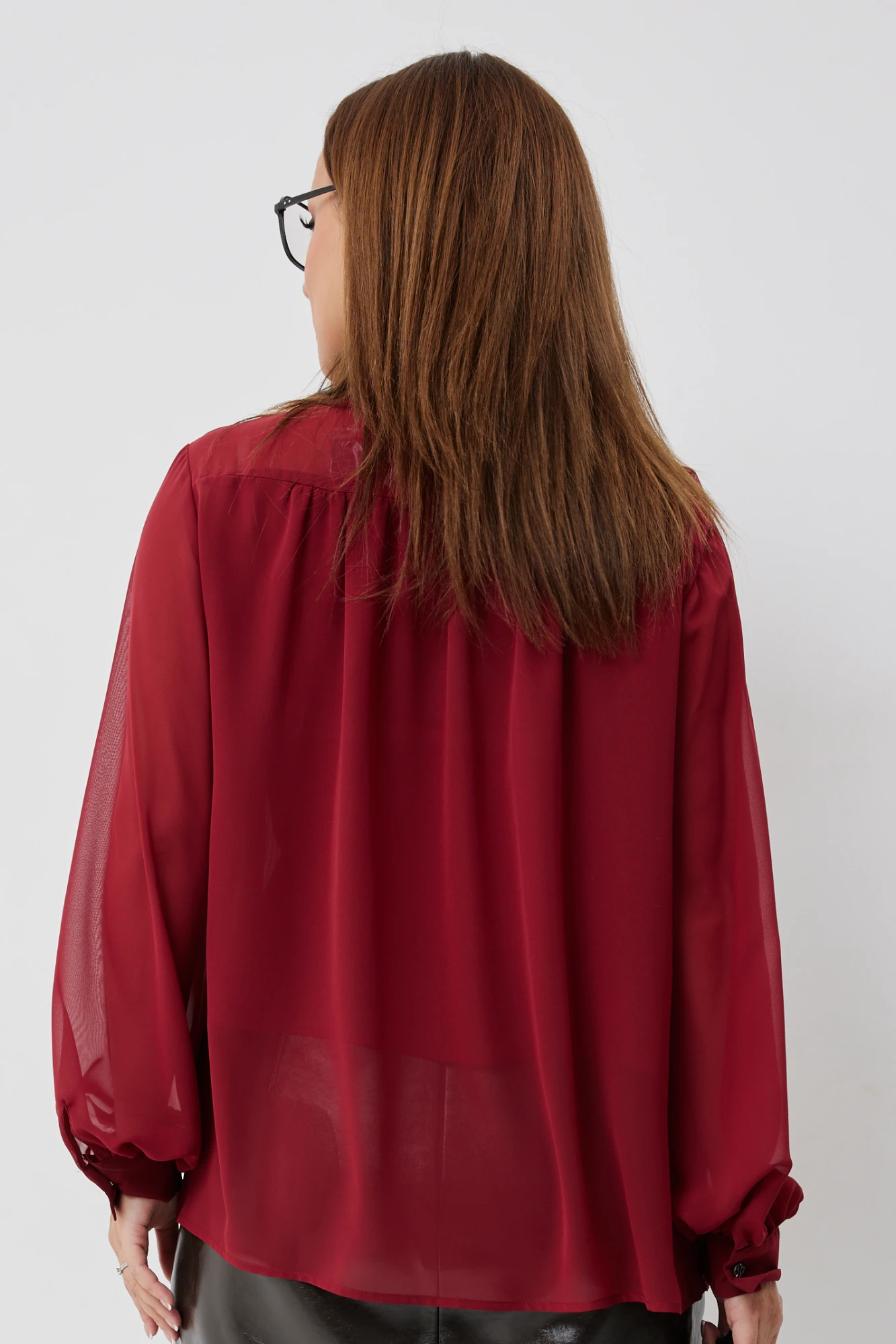Воротник блузки отложной на стойке добавляет изысканности, а длинные втачные рукава с манжетами, застегивающимися на петли-пуговицы, делают эту модель стильной и комфортной. Эта блузка станет отличным дополнением к вашему гардеробу и подчеркнет ваш неповторимый стиль.