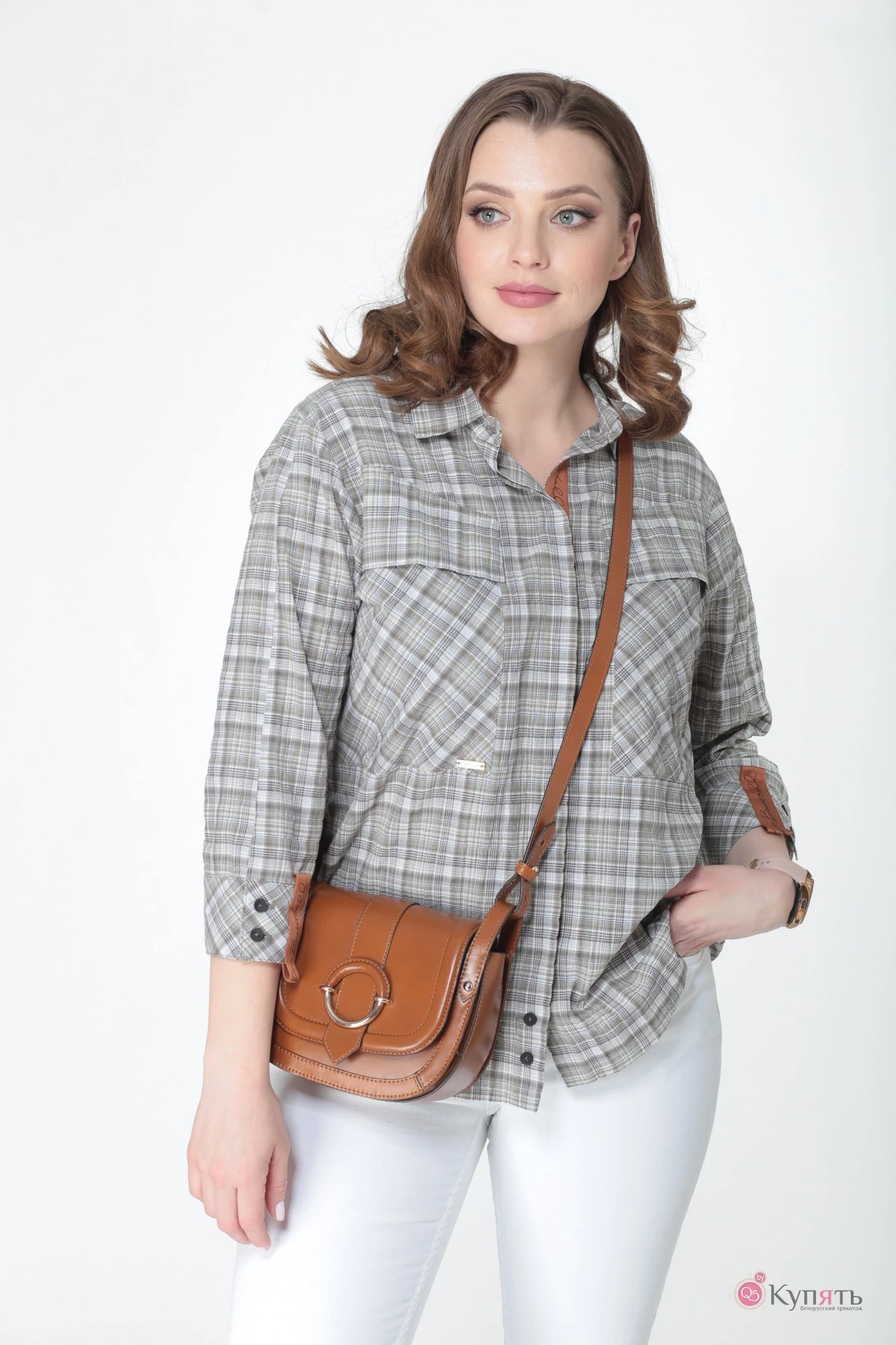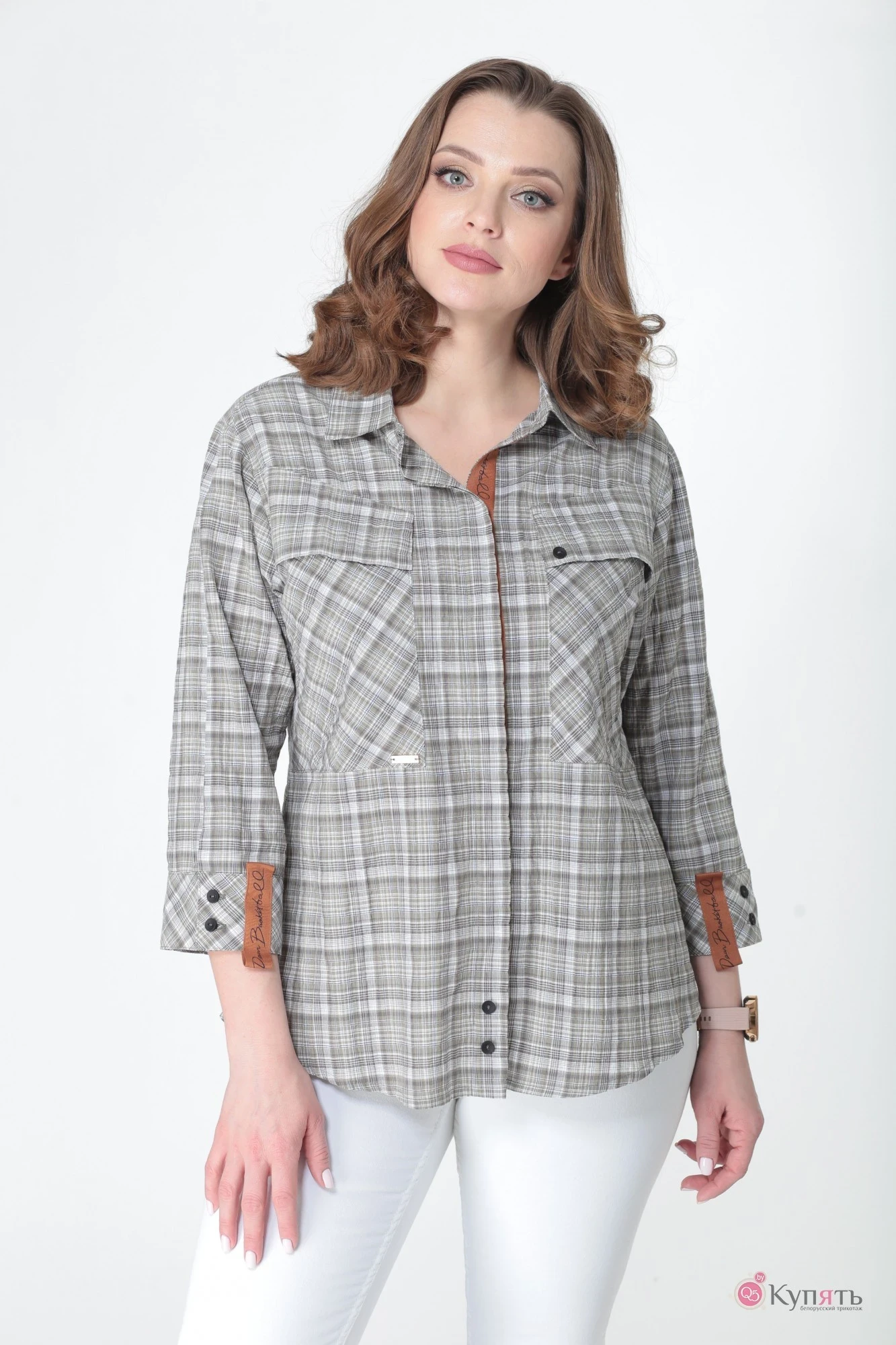 Стильная блузка-рубашка свободного силуэта из легкого хлопкового полотна. По переду потайная застежка на петли-пуговицы, с внутренней стороны планка декорирована контрастной тесьмой. Воротник рубашечного типа с отрезной стойкой, по спинке - кокетка и встречная складка по центру с декоративным пришивным элементом из тесьмы. Накладные карманы с клапанами фигурной формы и четкими линиями, расположены по переду изделия. Рукав с углубленной проймой, втачной, длиной 47 см, внизу с широкой притачной манжетой на застежке петли-пуговицы. Манжет декорирован отделочной контрастной тесьмой. Низ изделия фигурный, слегка расширенного силуэта. Дополнив модель определенными деталями, получили эффектный образ в любом размере. Такая рубашка удачно подойдёт к любому гардеробу в новом сезоне.
