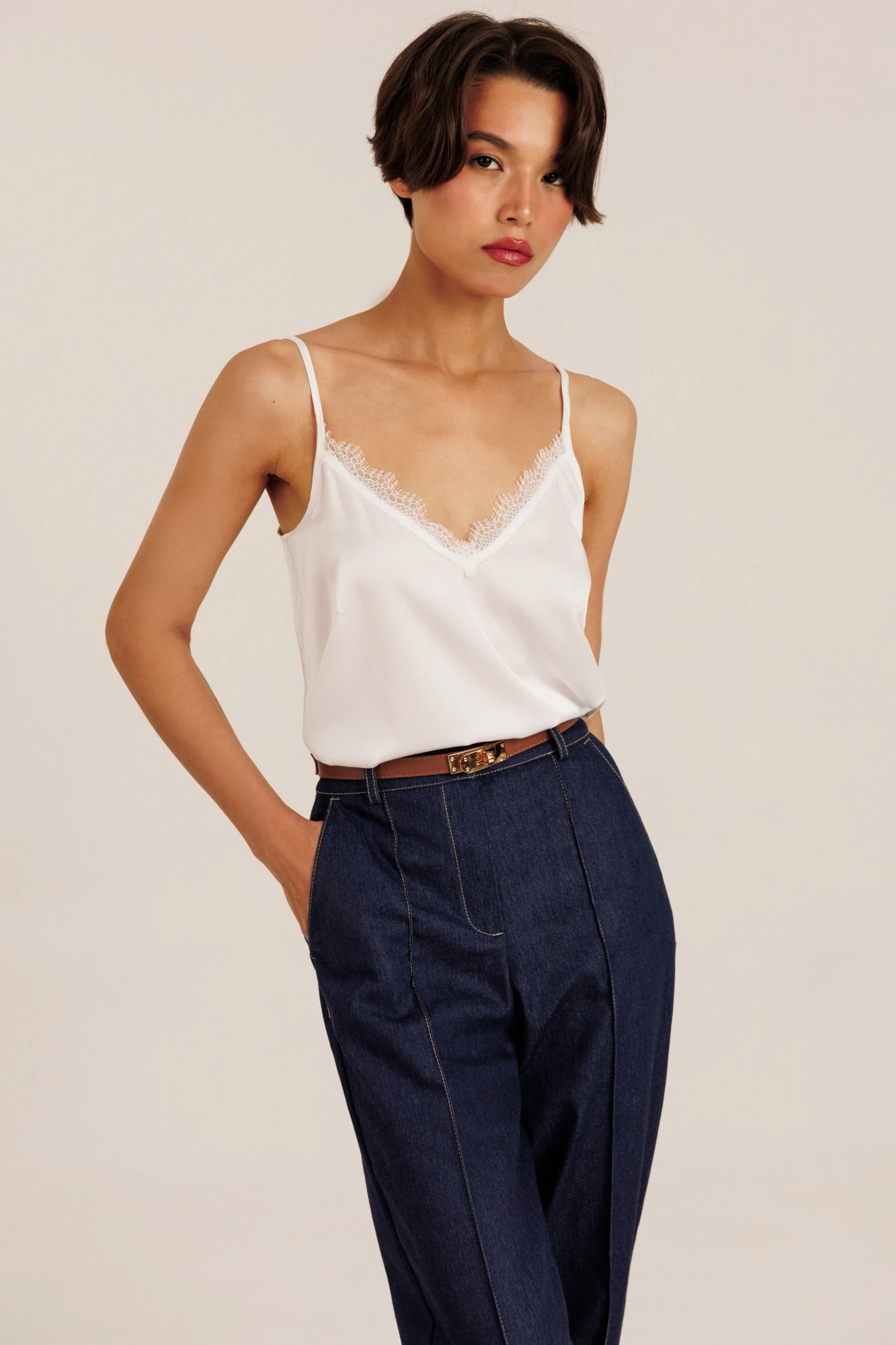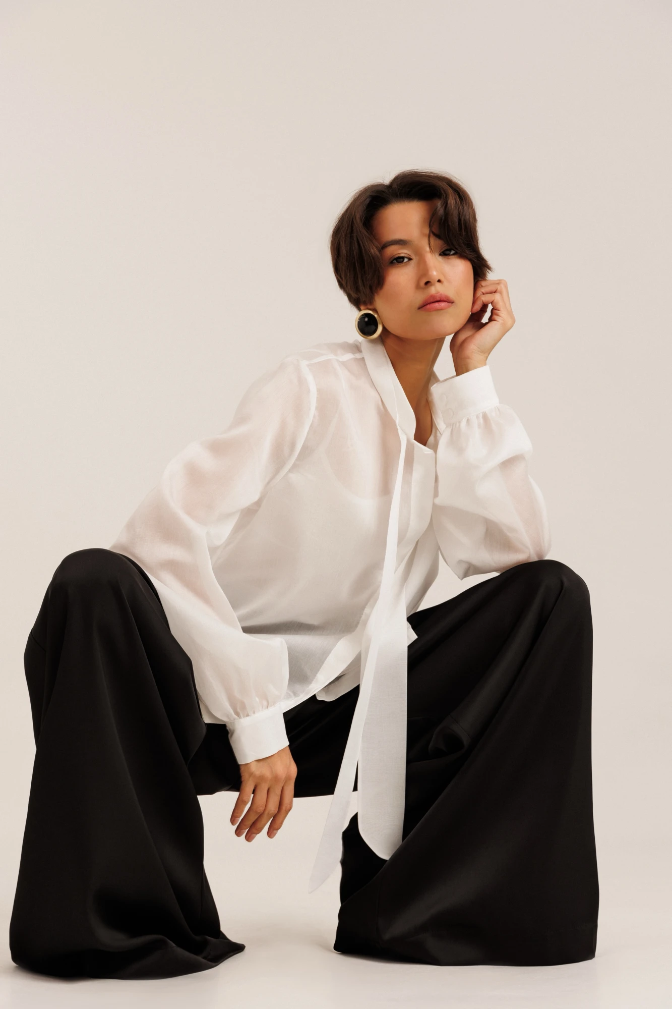 Блузка женская выполнена из полупрозрачного лиоцела. По горловине изделия выполнена стойка. Рукав длинный. Застежка потайная на пуговицах. В комплекте с блузкой идет топ на регулируемых бретелях