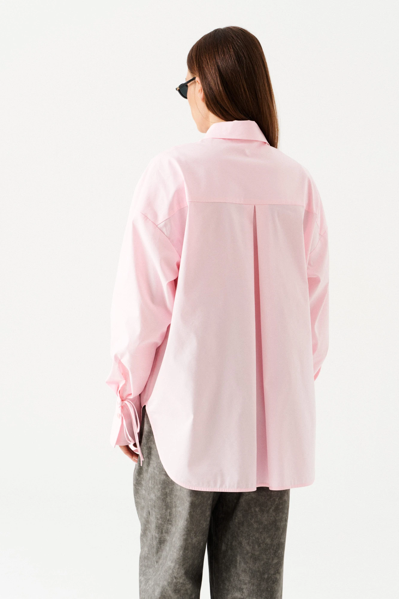 Блузка-рубашка, прямая, свободная, со спущенным плечом, с центральной застежкой на петли и пуговицы на завязках. Воротник рубашечный, отложной, на притачной стойке. Спинка с отрезной кокеткой, встречной складкой по шву притачивания кокетки. Линия низа – фигурная. Рукав втачной, длинный, с отрезной манжетой, застежкой на петли и пуговицы на завязках.