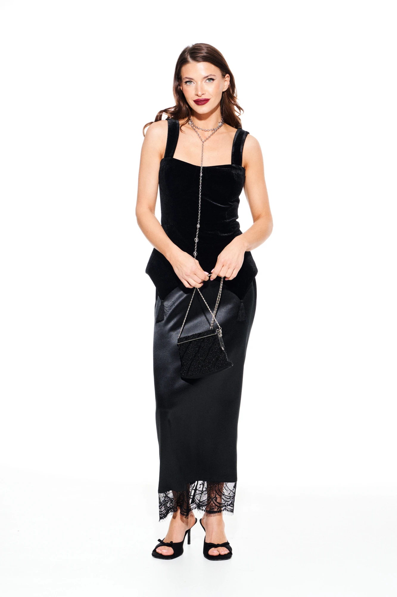Блузка из бархата на трикотажной основе, приталенного силуэта, отрезная по линии талии, на бретелях, на подкладке. Лиф переда с рельефами и отрезными чашками, с фигурной линией низа, декоративными кисточками из бахромы. Спинка с рельефами и средним швом, застежкой на тесьму-молнию. Центральные части спинки прострочены эластичной тесьмой.