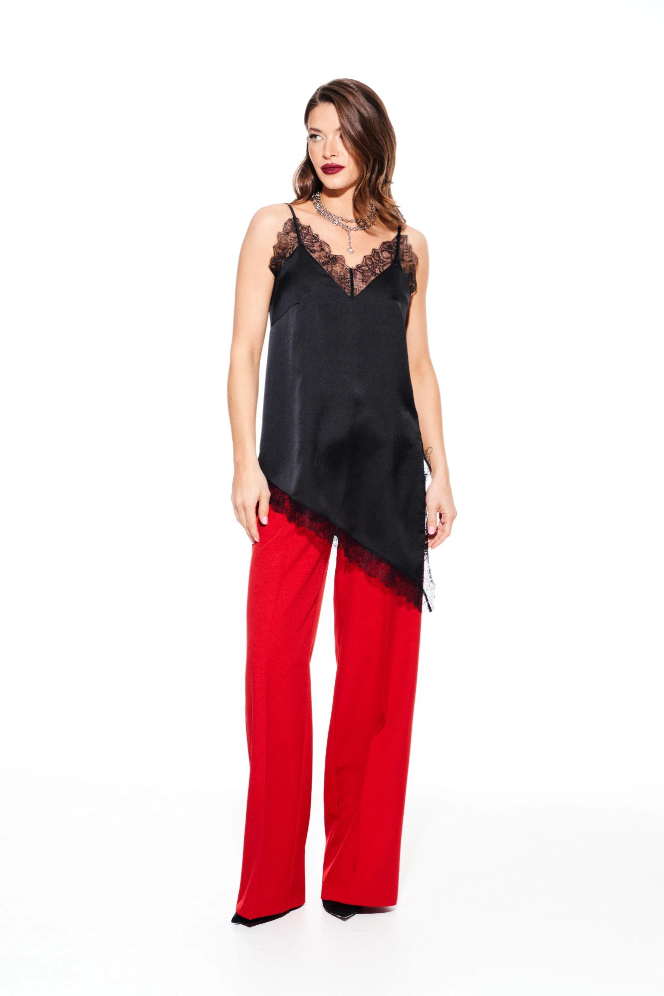 Блузка из струящейся ткани с блеском, с асимметричной линией низа, отделкой из кружева, на тонких регулируемых бретелях. Перед с V-образным вырезом горловины и нагрудными вытачками. В левом боковом шве фигурный разрез. Горловина, линия низа и разрез оформлены тесьмой из кружева.