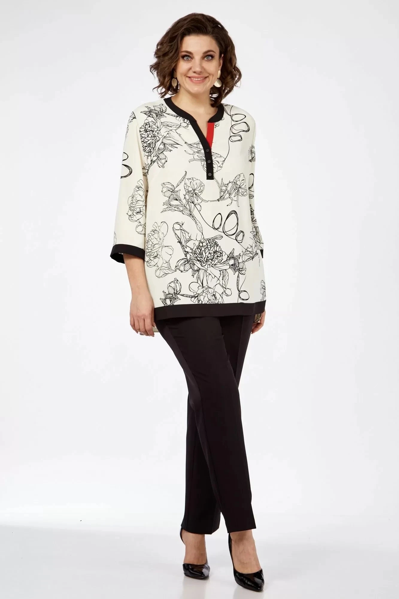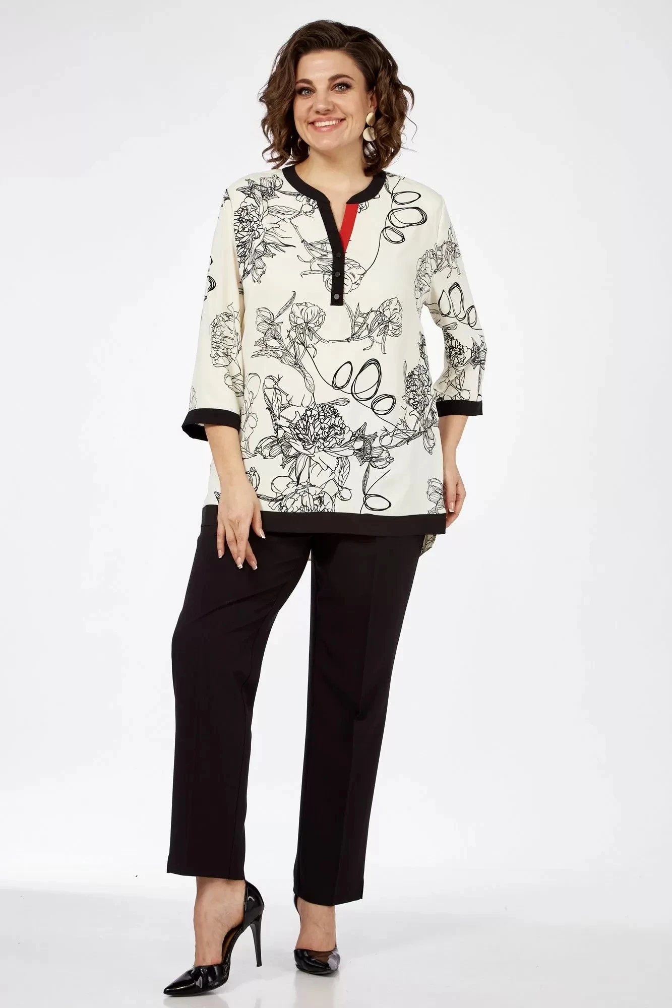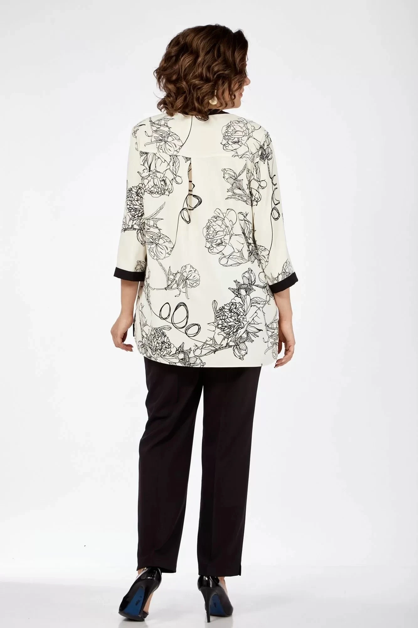 Блуза из легкой принтованной ткани, прямого силуэта. Вырез горловины V-образной формы, по центру полочки застежка в виде планки на петли и пуговицы, ярким акцентом является отделка из контрастной ткани, которая одновременно служит декоративным элементом. Рукав втачной, длина 7/8. Спинка с отрезной кокеткой, и встречной складкой, для повышенной комфортности. Низ изделия асимметричный в боковых швах предусмотрены разрезы.