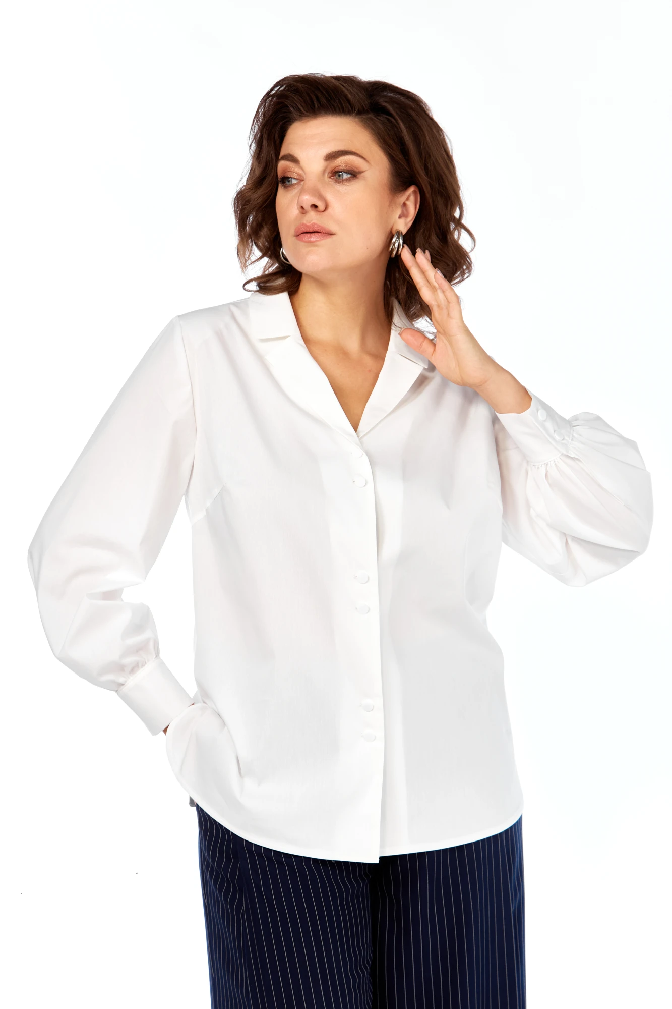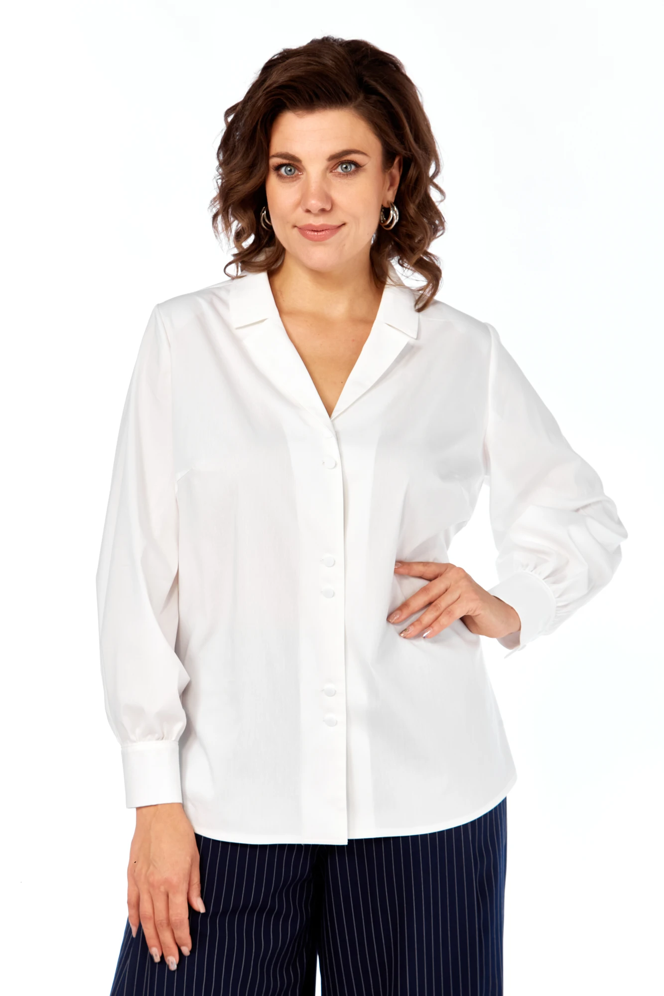 Прекрасный вариант для визитов в офис, а так же в место, где уместен деловой стиль. Идеальные возможности для создания современного офисного стиля с использованием хлопковой блузы. Модель полуприлегающего силуэта с застежкой спереди на пуговицы. Воротник аккуратный отложной. Рукав втачной, по низу оформлен складками и притачной манжетой, застегивающейся на пуговицы. В боковых швах скругленные разрезы. Спинка с вертикальными выточками.