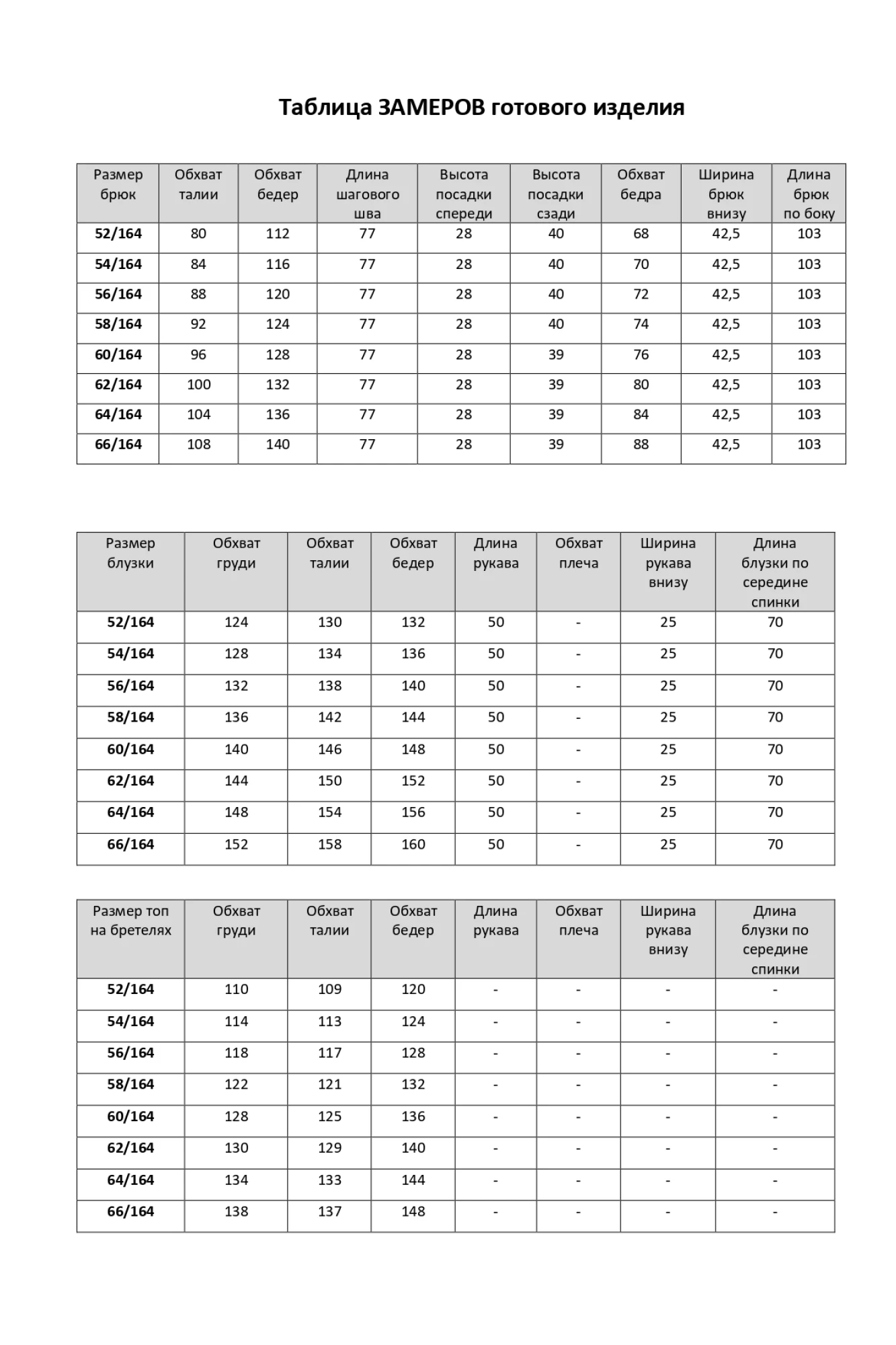 Таблица размеров