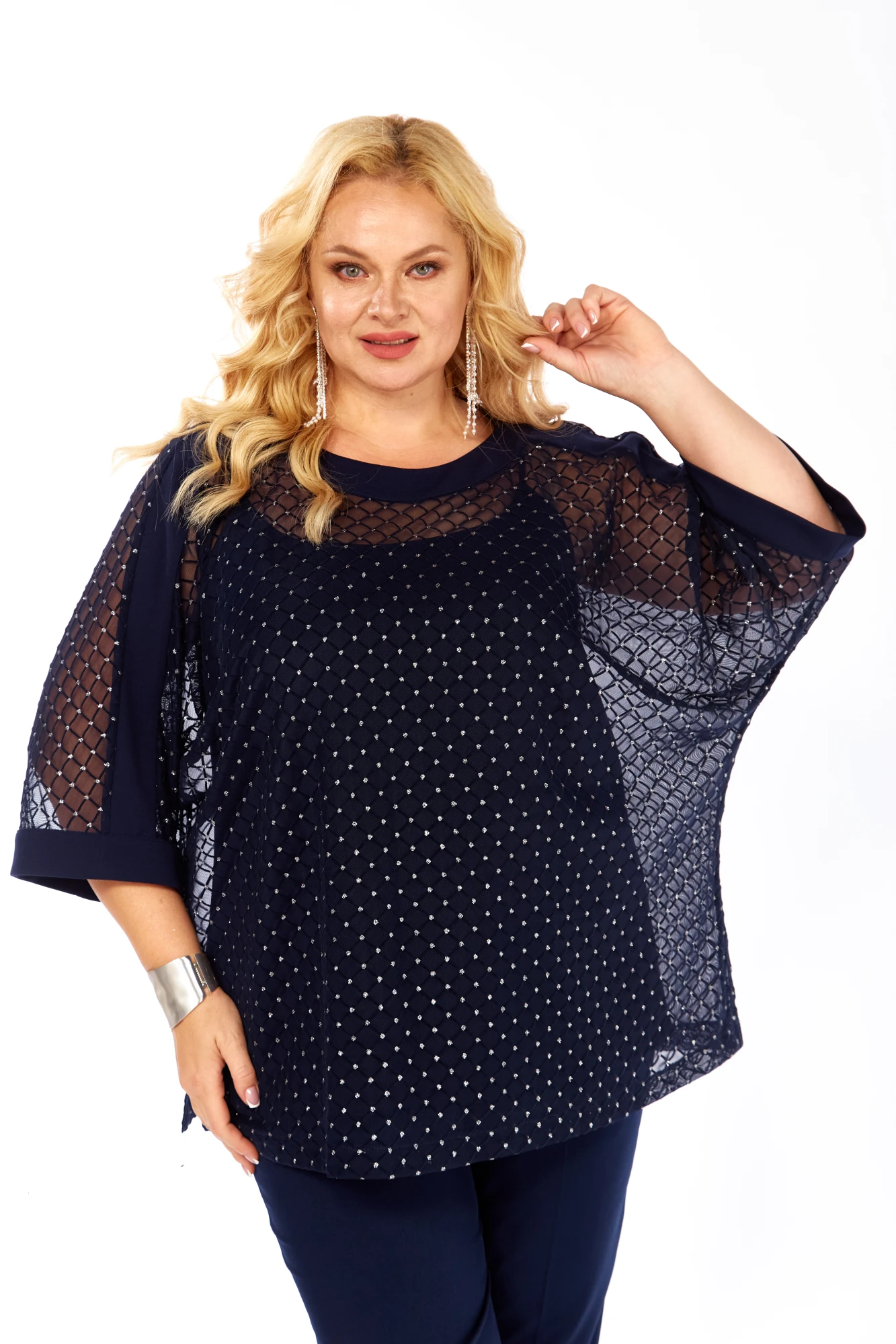 Праздничная элегантная блузка полуприлегающего силуэта, выглядит эффектно, прекрасно подойдет для вечерних мероприятий. Горловина аккуратной округлой формы. Рукав втачной, свободный, длина 7/8. В боковых швах предусмотрены разрезы. Топ входит в комплект.