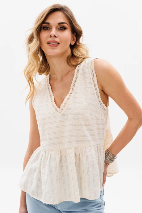 Блузка выполнена из плательно-блузочной ткани. Блузка А-образного силуэта, длиной выше линии бедер. Спереди и на спинке баска со сборкой по линии притачивания. Горловина переда V-образной формы. Головина спинки округлой формы. Блузка декорирована отделочной тесьмой.