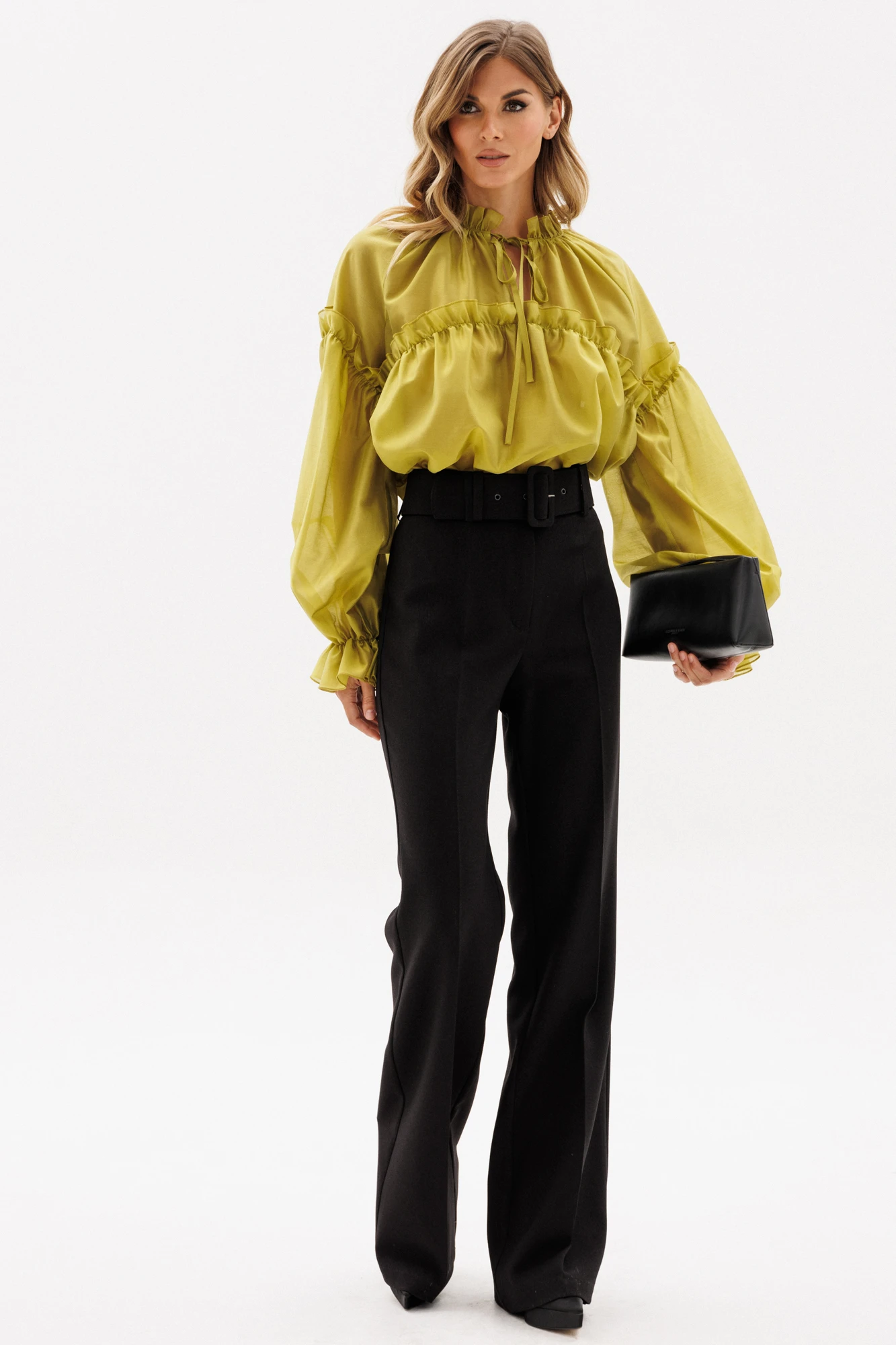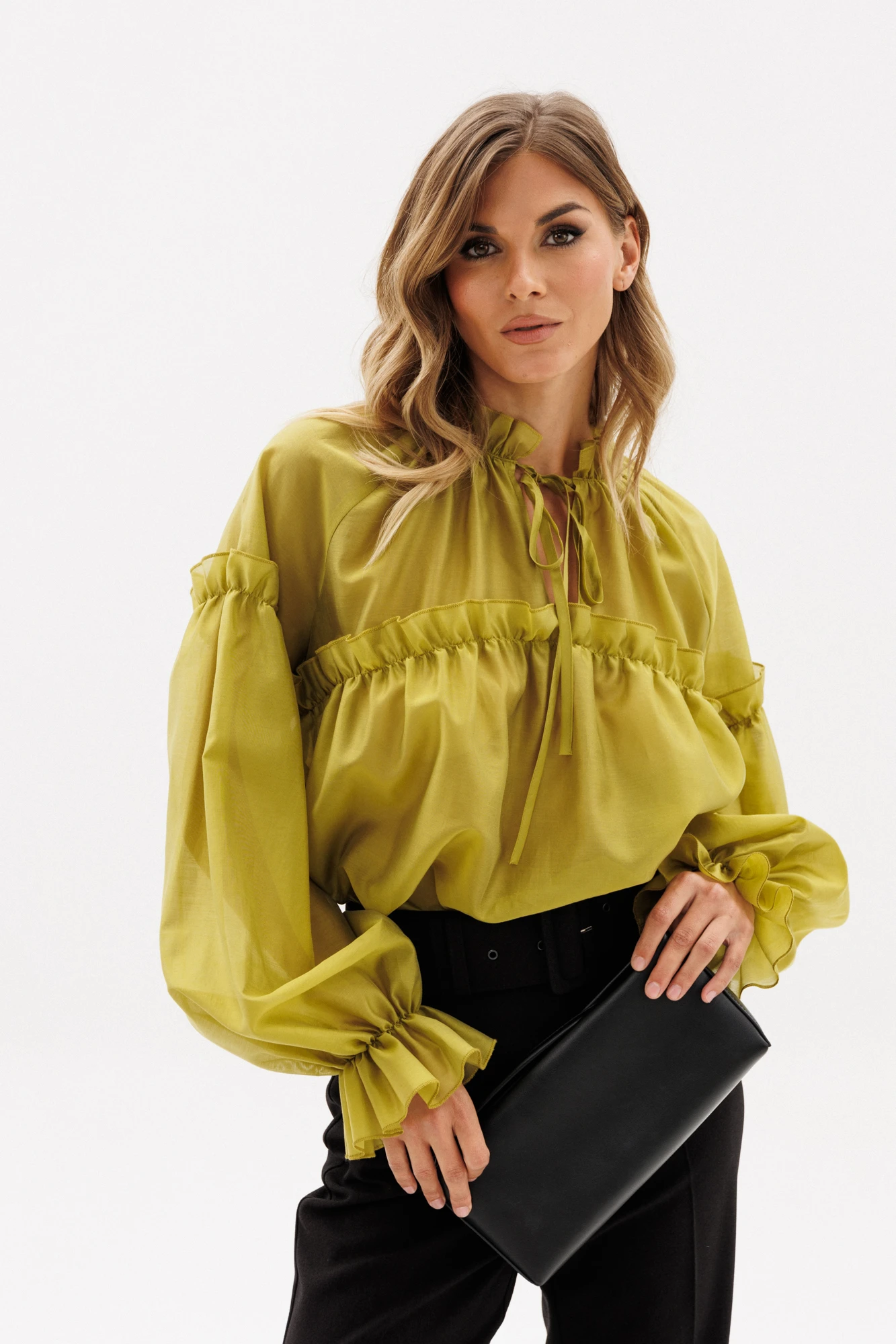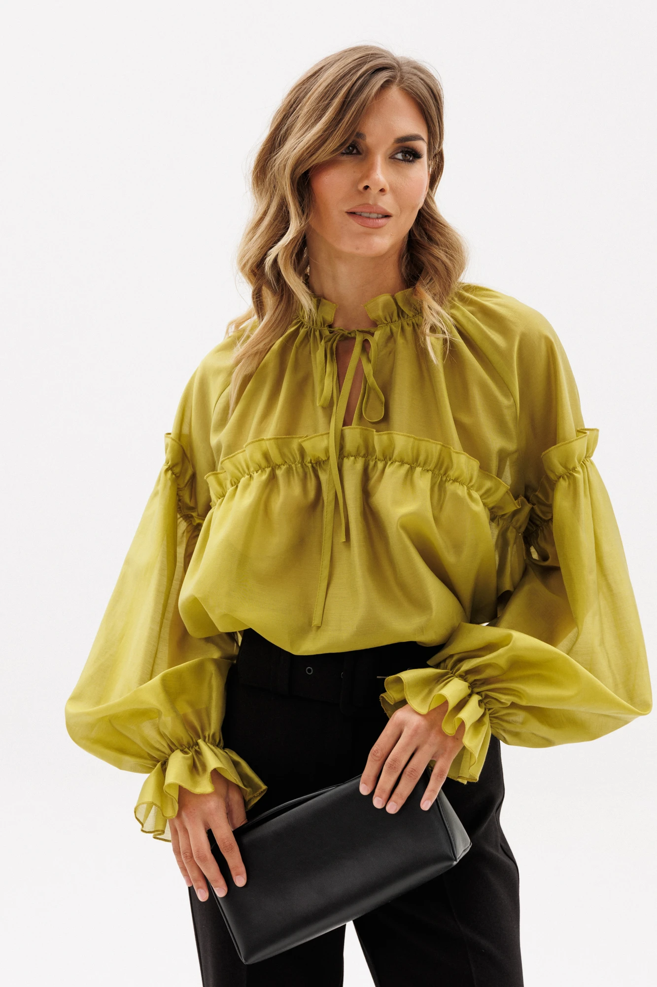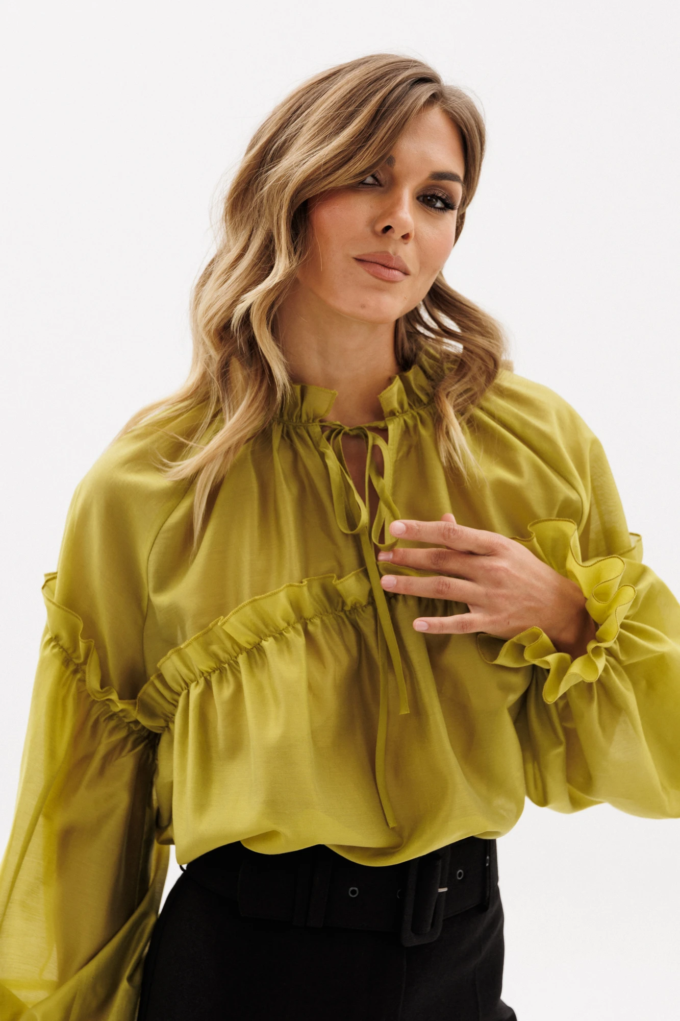 Блузка выполнена из плательно-блузочной ткани. Блузка прямого силуэта, длиной до линии бедер. Спереди и по спинке средний шов и кокетки со сборками от них. Рукав реглан, расширенный к низу. Блузка декоррирована оборками из основной ткани по линиям кокеток переда и спинки, и по верхнему шву рукава.