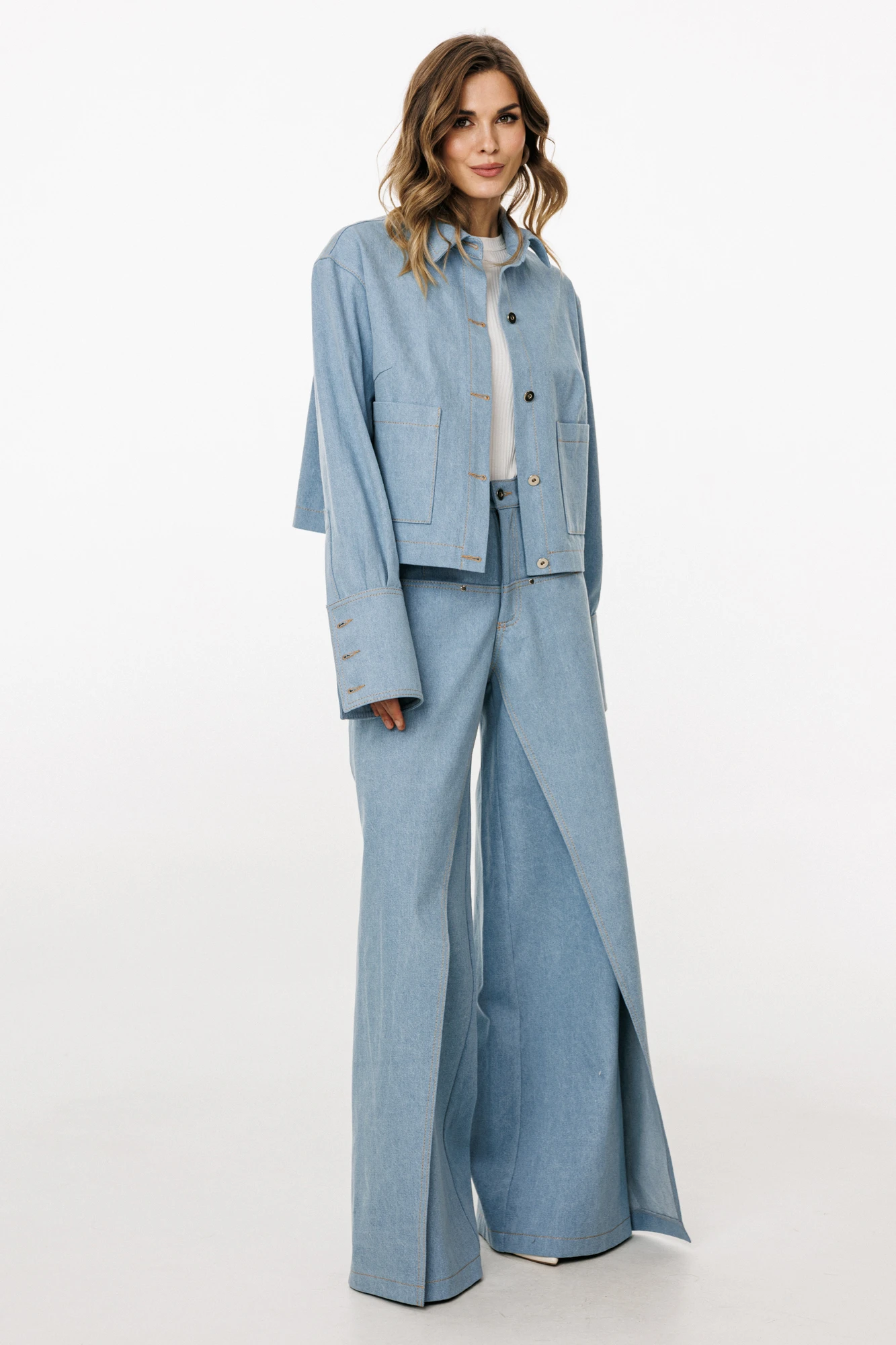 Блузка выполнена из плотного джинса. Блузка прямого силуэта, длиной ниже линии талии. Спереди накладные карманы и центральная застежка с планкой на пробивные пуговицы. На спинке кокетка и две складки. Воротник стояче-отложной с отрезной стойкой. Плечевой шов удлинен. Рукав рубашечного покроя, одношовный. Низ рукава на притачной манжете с застежкой на пробивные пуговицы. Рукав удлинен. Блузка декорирована по кокетке спинки нашивкой из натуральной кожи.