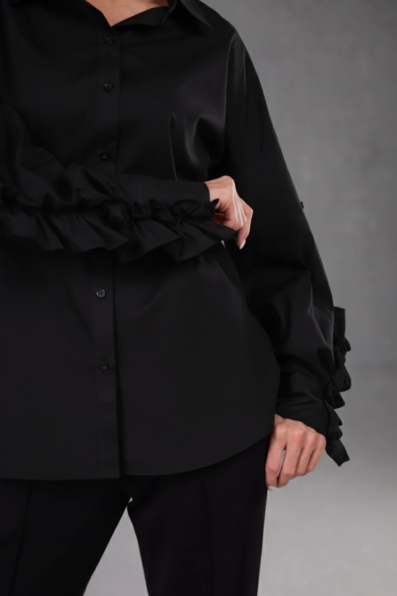 Блузка прямого силуэта со спущенной линией плеча . Спинка с кокеткой и встречной складкой посередине. Свободный крой с манжетой и декоративной патой позволяет регулировать длину, превращая длинный рукав в 3/4 или даже короче, подстраиваясь под погоду или настроение. По линии кокетки и рукава настрочены декоративные рюши в цвет изделия.Самая яркая "изюминка" – декоративные рюши в цвет изделия, настроченные по линии кокетки и рукава! Они добавляют блузке игривости, женственности и уникального шарма, делая ее по-настоящему особенной. Классический рубашечный воротник элегантно завершает образ, привнося нотку строгости в этот калейдоскоп деталей.