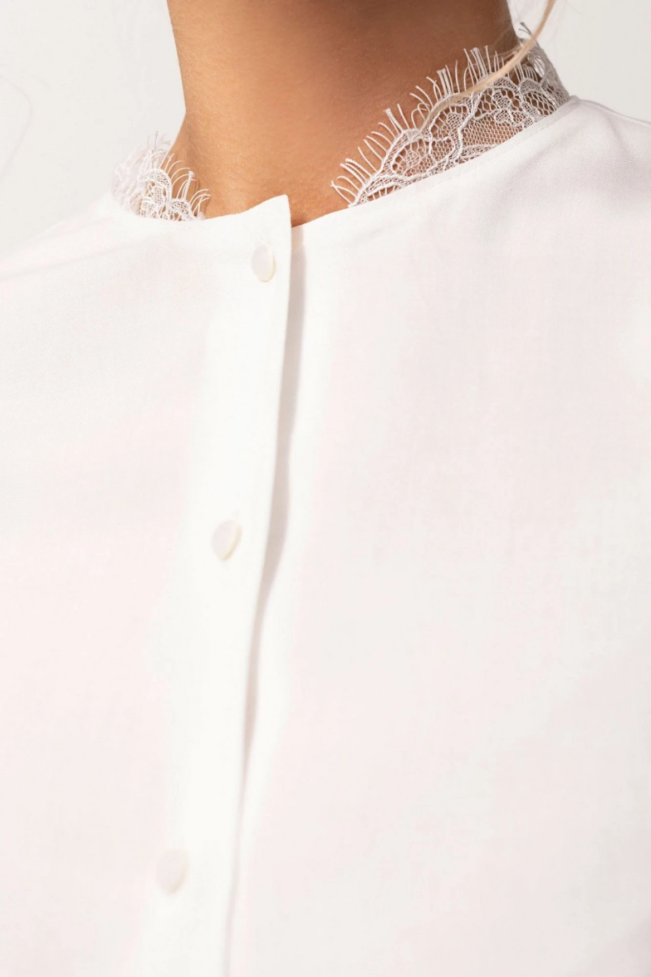 Цветовая гамма для верха, подкладки, фурнитуры, отделки: блузка выполнена из ткани в одной цветовой гамме, стойка и манжеты из кружева.