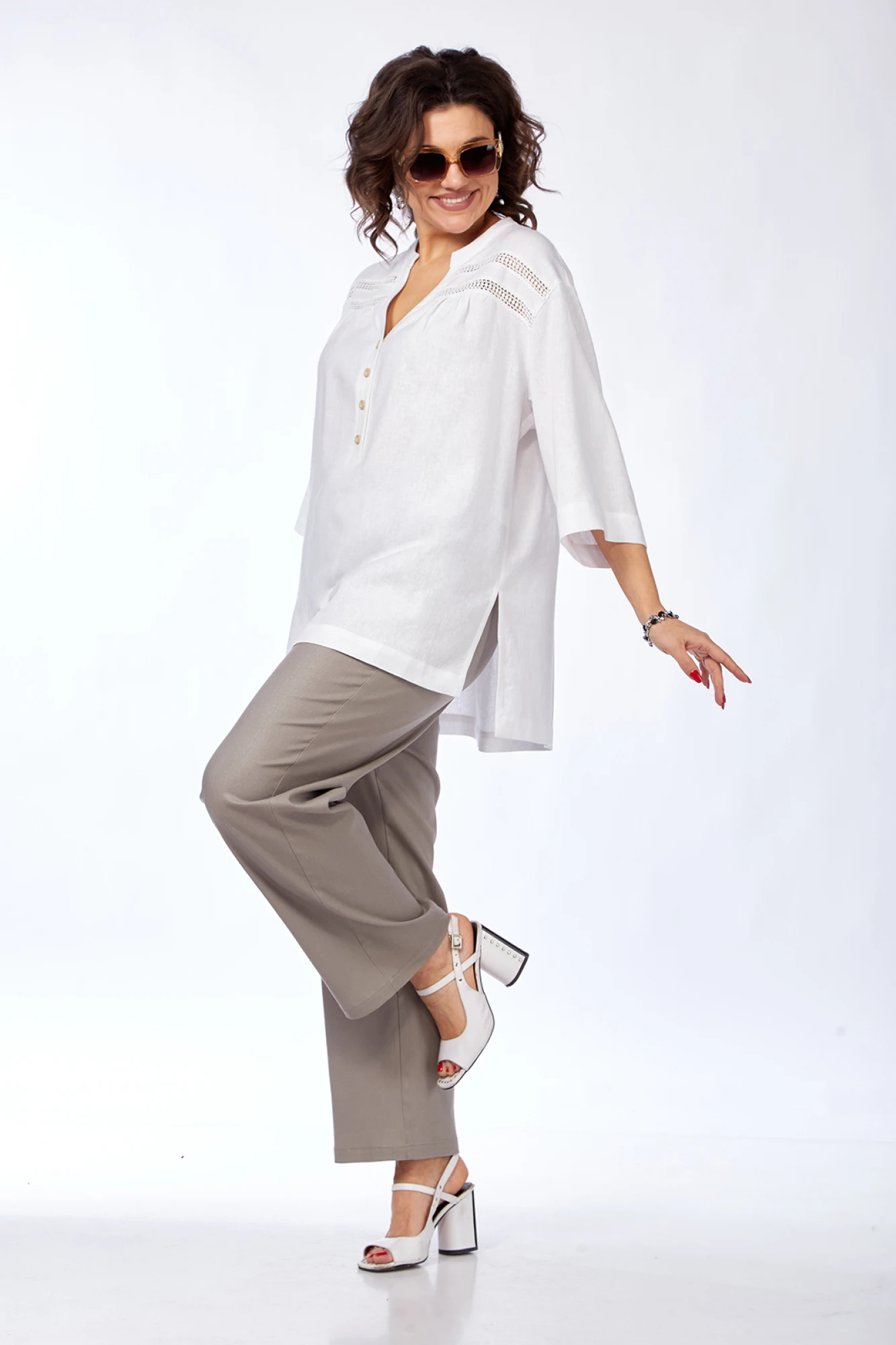 Блузка женская свободного силуэта, выполнена из льняной ткани белорусского производства. Горловина фигурной формы обработана планками и плосколежащей стойкой. По переду имеются кокетки со вставками из кружевной тесьмы, под кокетками небольшая сборка. Спинка на кокетке со вставкой из кружева и встречной складкой. В боковых швах обработаны разрезы. Рукава втачные, с широкой подборкой низа.