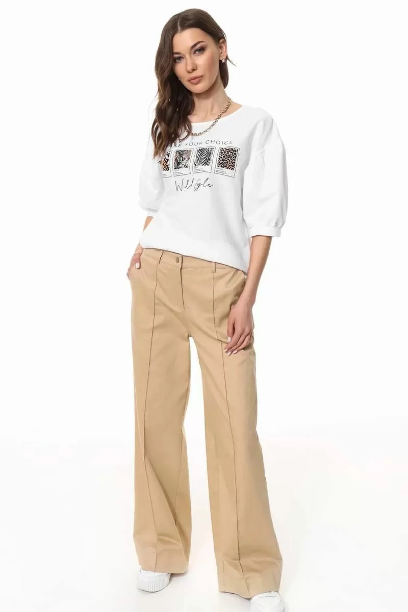 Блуза женская, прямого силуэта, со спущенной линией плеча. Перед декорирован авторским принтом. Рукав со сборкй по окату и манжетой по низу рукава, которая застегивается на петлю и пуговицу. Спинка со средним швом. Горловина округлой формы. Декоративные элементы и фурнитура могут отличаться от заявленных на фото.