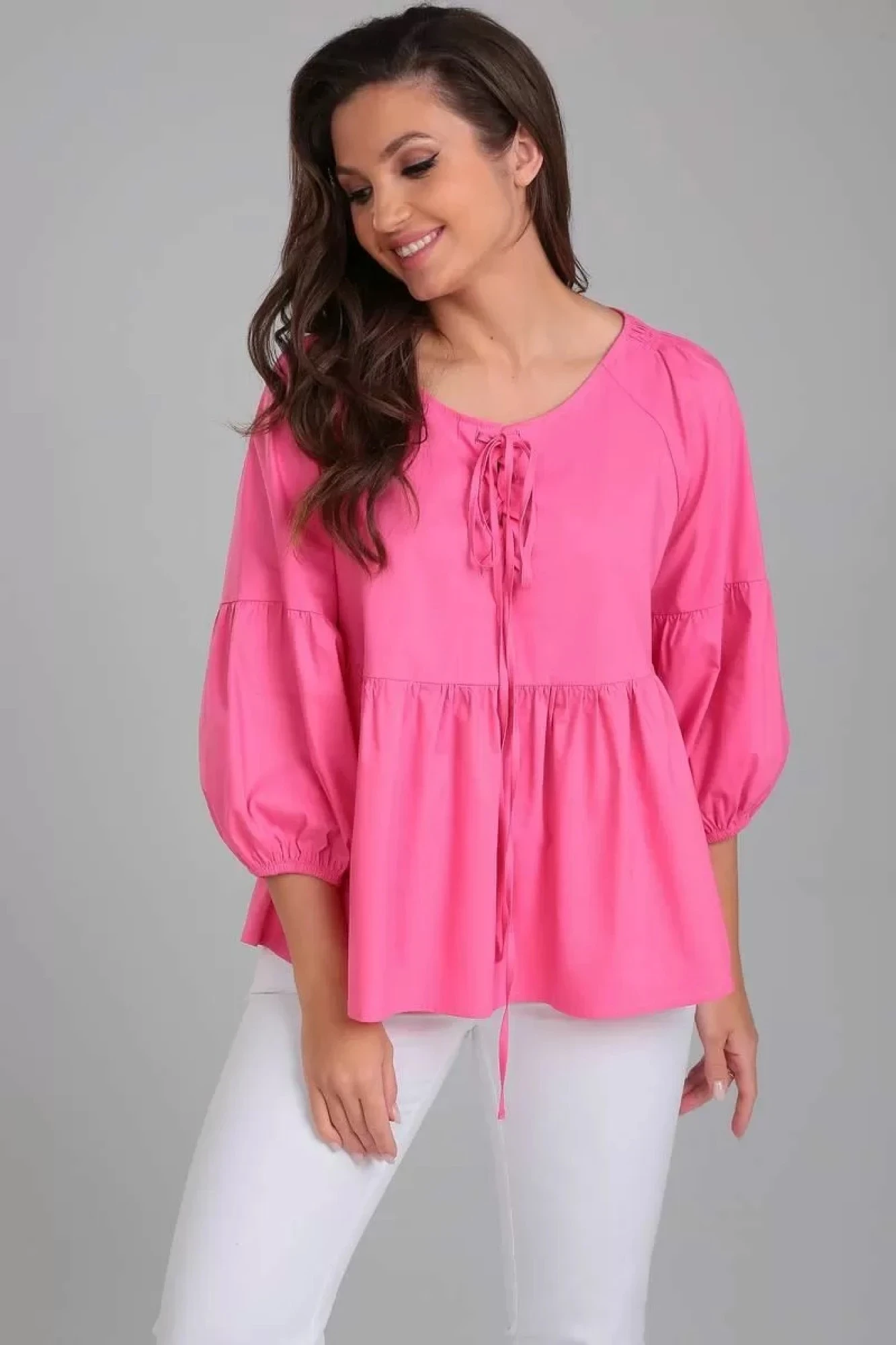 Блузка А-образного силуэта с подрезом ниже линии груди. Нижняя часть блузки со сборкой. Горловина круглой формы. В области горловины декоративный элемент в виде разреза с завязками. Рукав реглан укороченный с горизонтальным подрезом. Нижняя часть рукава со сборкой по верхнему и нижнему срезам. Рукав в области горловины с декоративной сборкой.