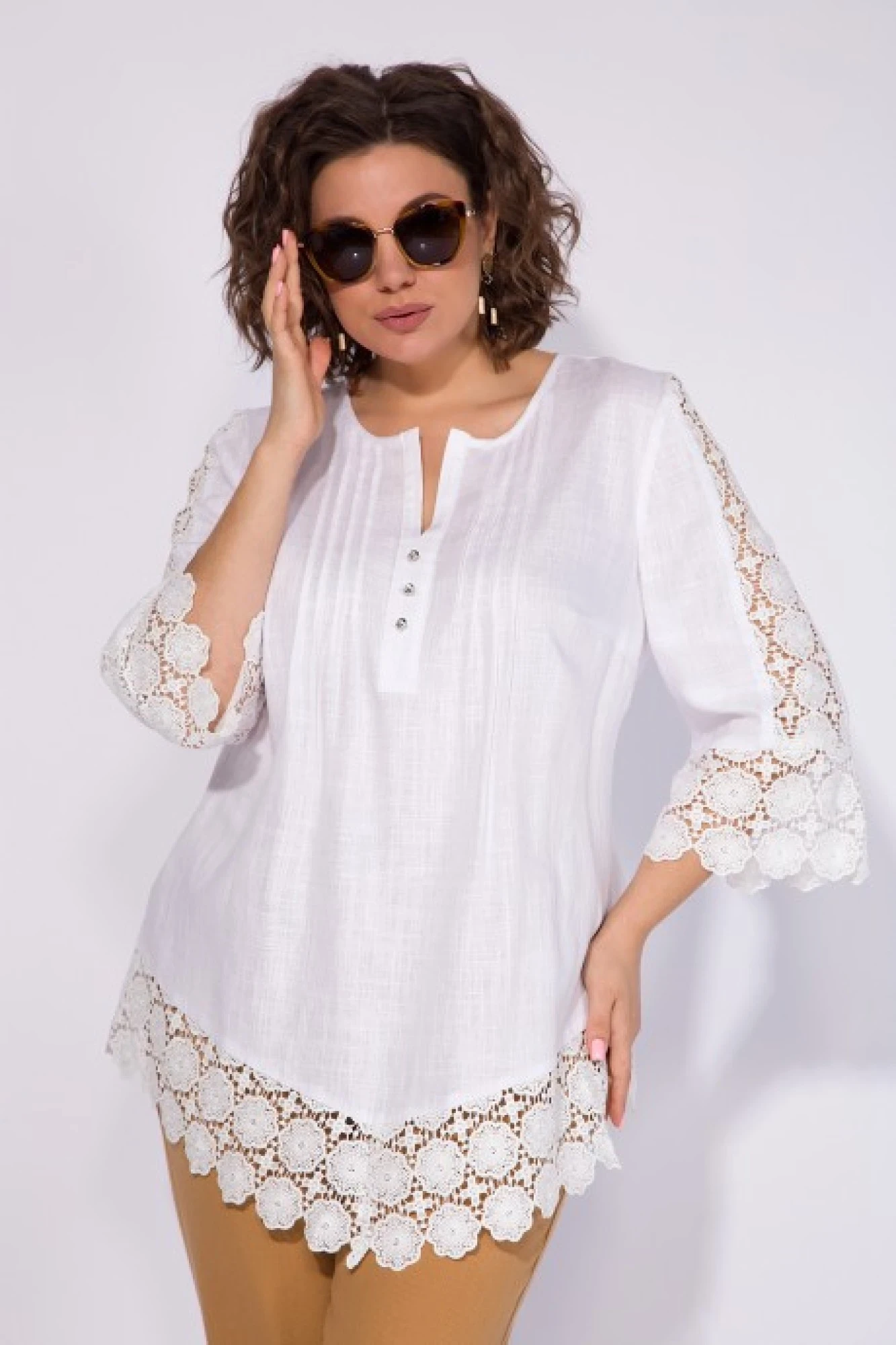 Эффектная летняя модель блузки - туники свободного силуэта. Модель С округлым вырезом горловины, переходящий в V-образный вырез на тоненьких планках. По лифу застрочены мелкие складки-защипи. Рукав вточной, с продольной вставкой из кружева. По низу - кружевной манжет с каймой. Низ фигурный, удлинённый по центру, что скрывает все недостатки. Низ полочки и спинки со вставками из хлопкового кружева. Ткань основа-легкая, дышащая…. Данная модель отлично сочетается с базовыми брючками под лен из коллекции от бренда LILIANA! ХИТ продаж весна- лето 2024!
