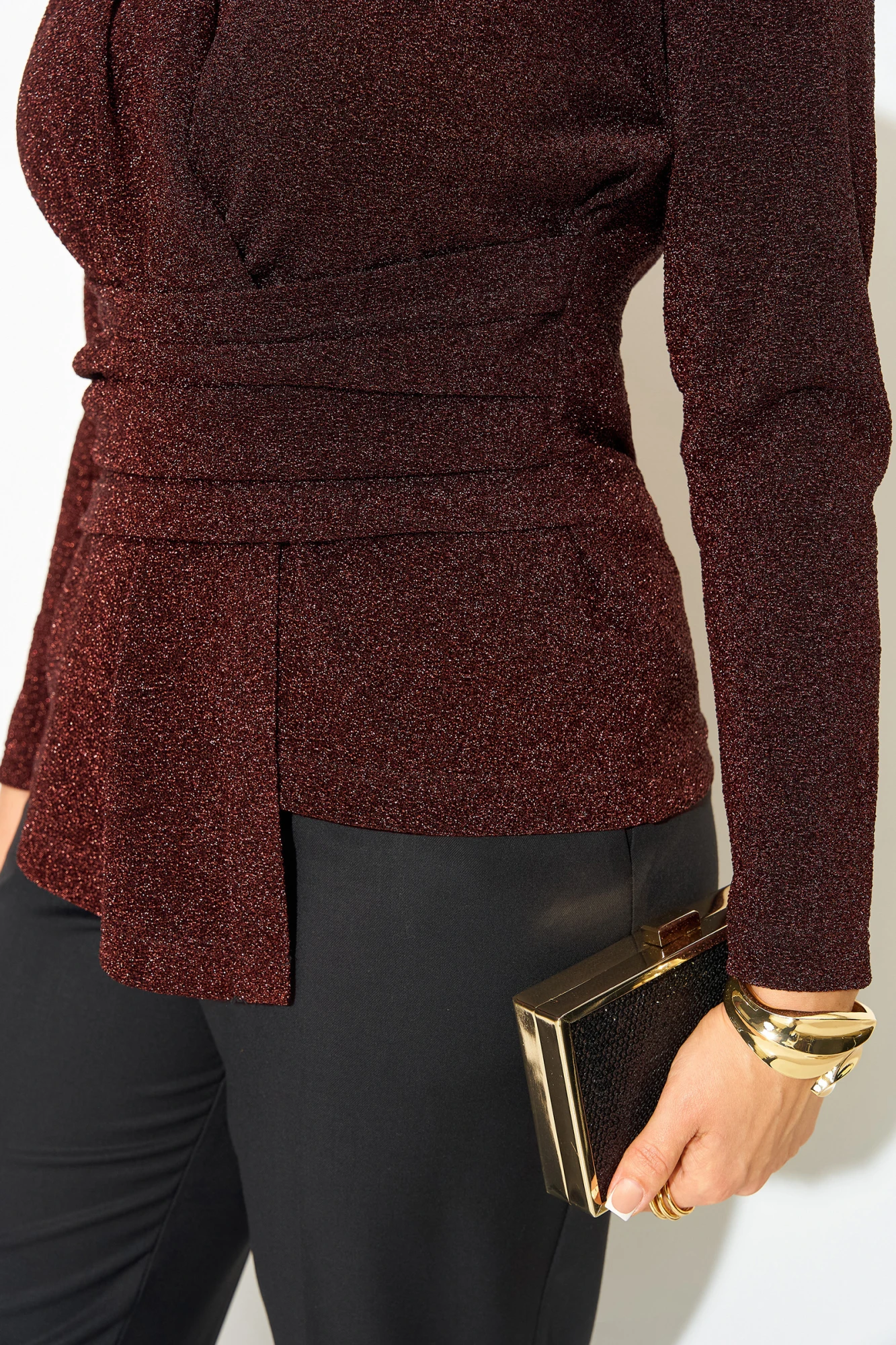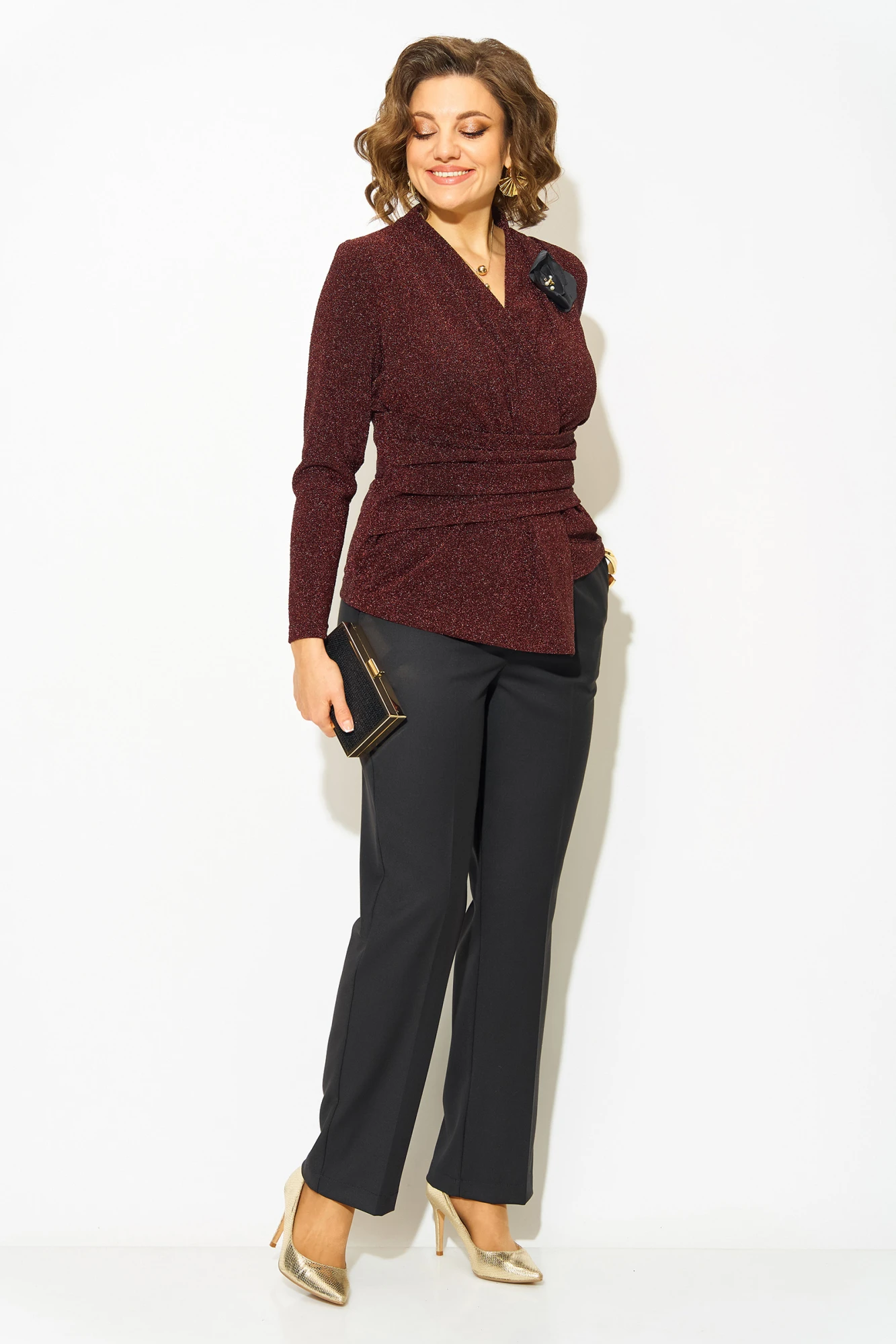 Эффектная нарядная блузка, выполнена из мягкого трикотажа с мерцающим эффектом. Такой дизайн ткани придает необычное переплетение нитей: с изнанки мягкий однотонный трикотаж! Вырез горловины мягкая стойка, переходящая в V-образный вырез с имитацией запаха. По полочке заложены декоративные складки для комфортного прилегания изделия. Низ блузки ассиметричный. Пояс декорирован задрапированным поясом из основной ткани, что зрительно стройнит и скрывает все недостатки фигуры. Рукав в точной, длинный. Спинка приталенная, без особенностей. К блузке предусмотрен съемная брошь, в виде цветка. Отлично сочетается с базовыми однотонными брюками из коллекции Лилиана.
