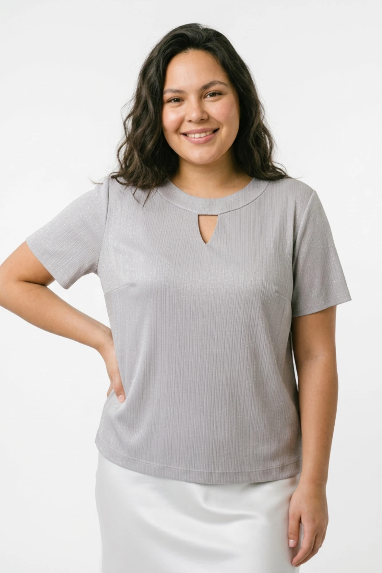 Женская блузка с лёгким мерцанием — элегантная и универсальная модель, которая идеально подойдёт для офиса, повседневных образов и нарядных выходов. Блуза выполнена в благородном сером оттенке с лёгким серо-зеленоватым подтоном — сложный и актуальный цвет, который смотрится дорого и легко сочетается с брюками, юбками и костюмами разных оттенков. Модель представлена в размерах 48–56 и отлично подходит для женщин, которые ценят комфорт, аккуратную посадку и современный стиль.
