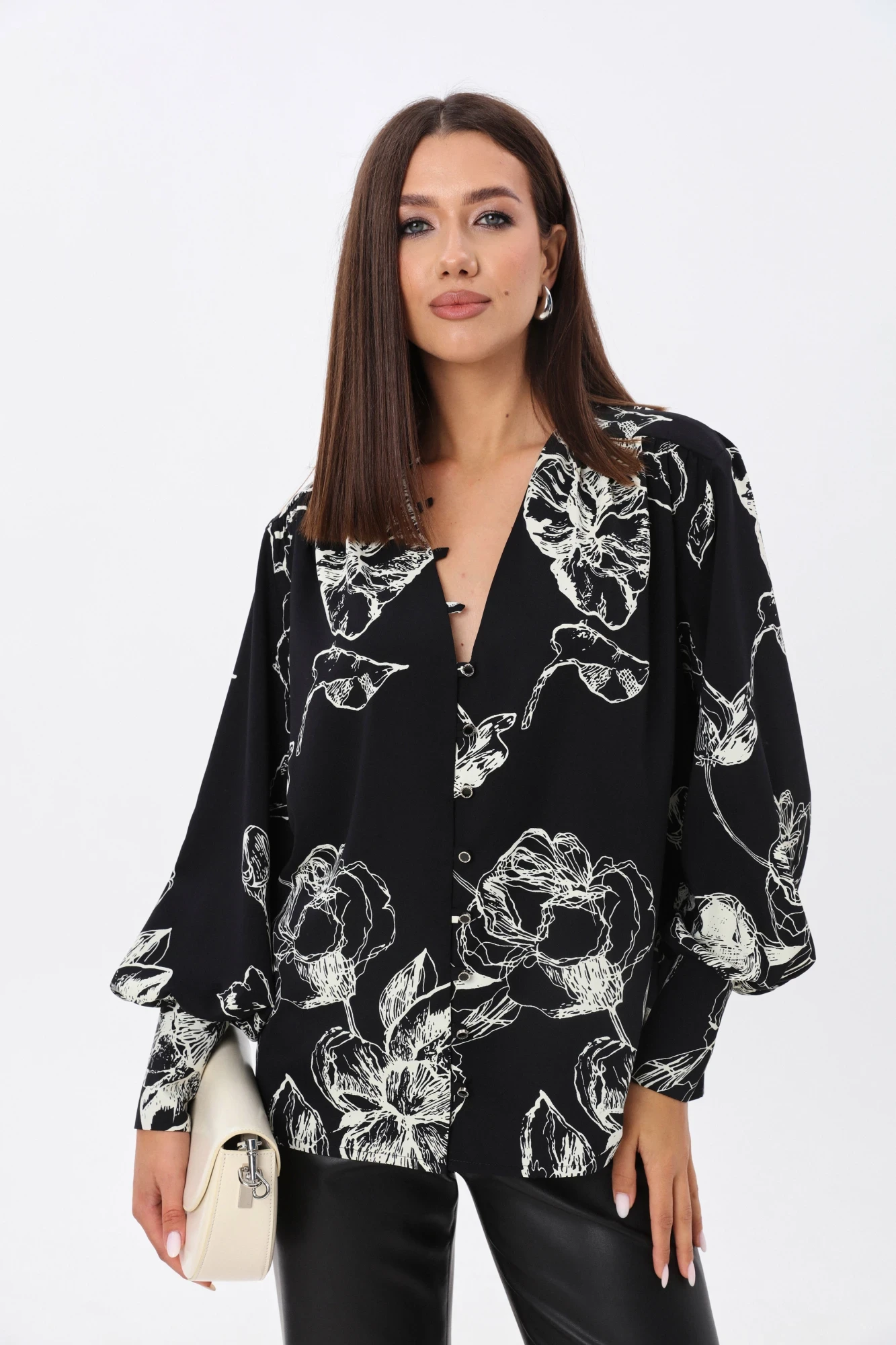 Изящная блуза из нежной ткани с цветочным принтом. Блуза свободного силуэта с V-образным вырезом. Это довольно глубокий вырез, который прекрасно подчёркивает декольте и линию шеи. Застежка на навесные петли и пуговицы. Рукава длинные объёмные втачные заканчиваются широкой манжетой с застёжкой на навесные петли с пуговицами. Рост фотомодели 175 см. Размер у фотомодели – 44.