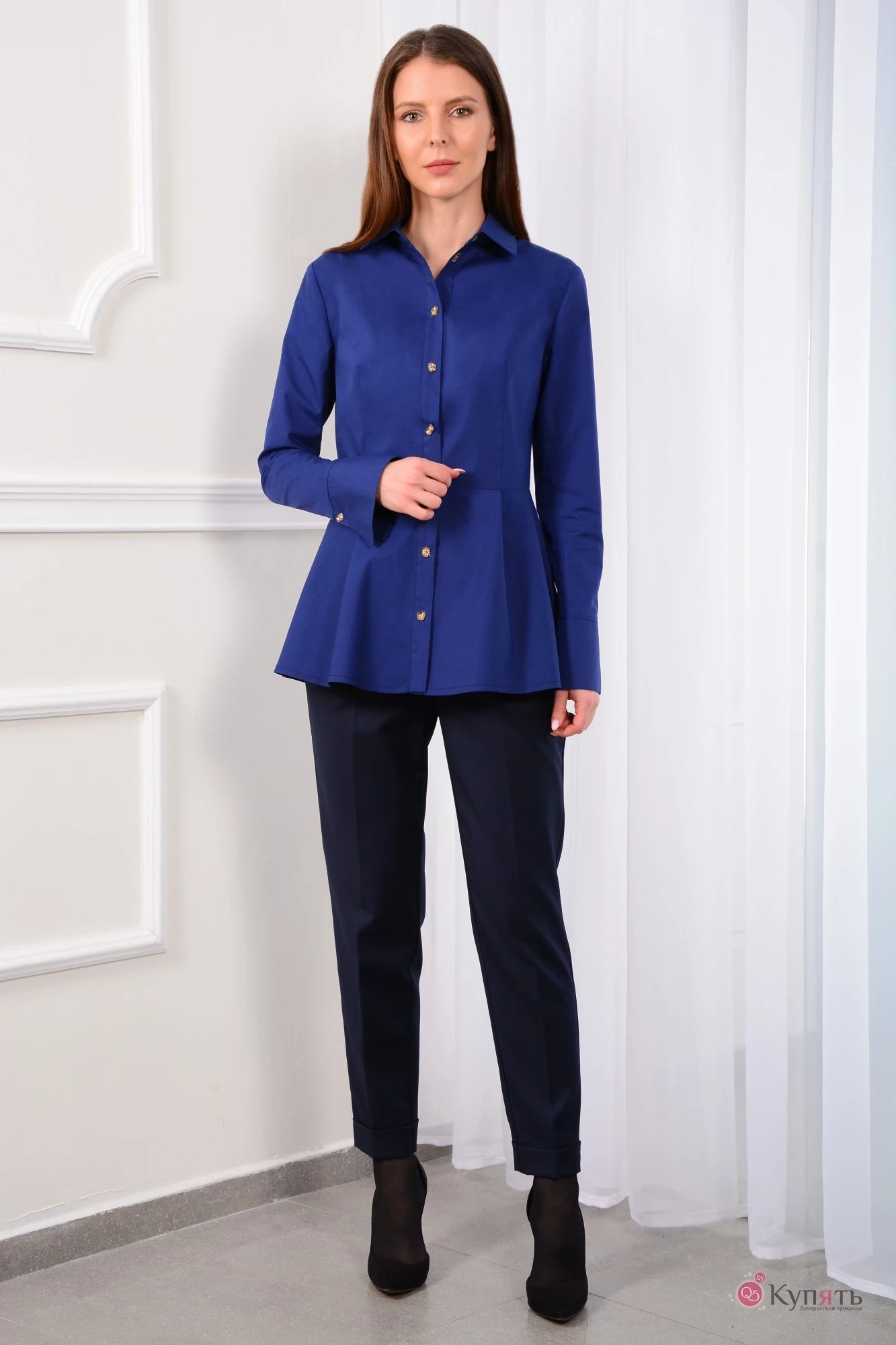 Блуза сочного синего цвета с баской, которая способна визуально уменьшить и подчеркнуть вашу талию. Данная модель обладает уникальной способностью подчеркивать линию талии таким образом, чтобы создавался эффект идеальной фигуры в форме песочных часов. Блуза с отложным воротником и притачной планкой на петли и пуговицы. Рукав втачной двухшовный с притачной манжетой и застежкой на петли и пуговицы типа «запонки».
