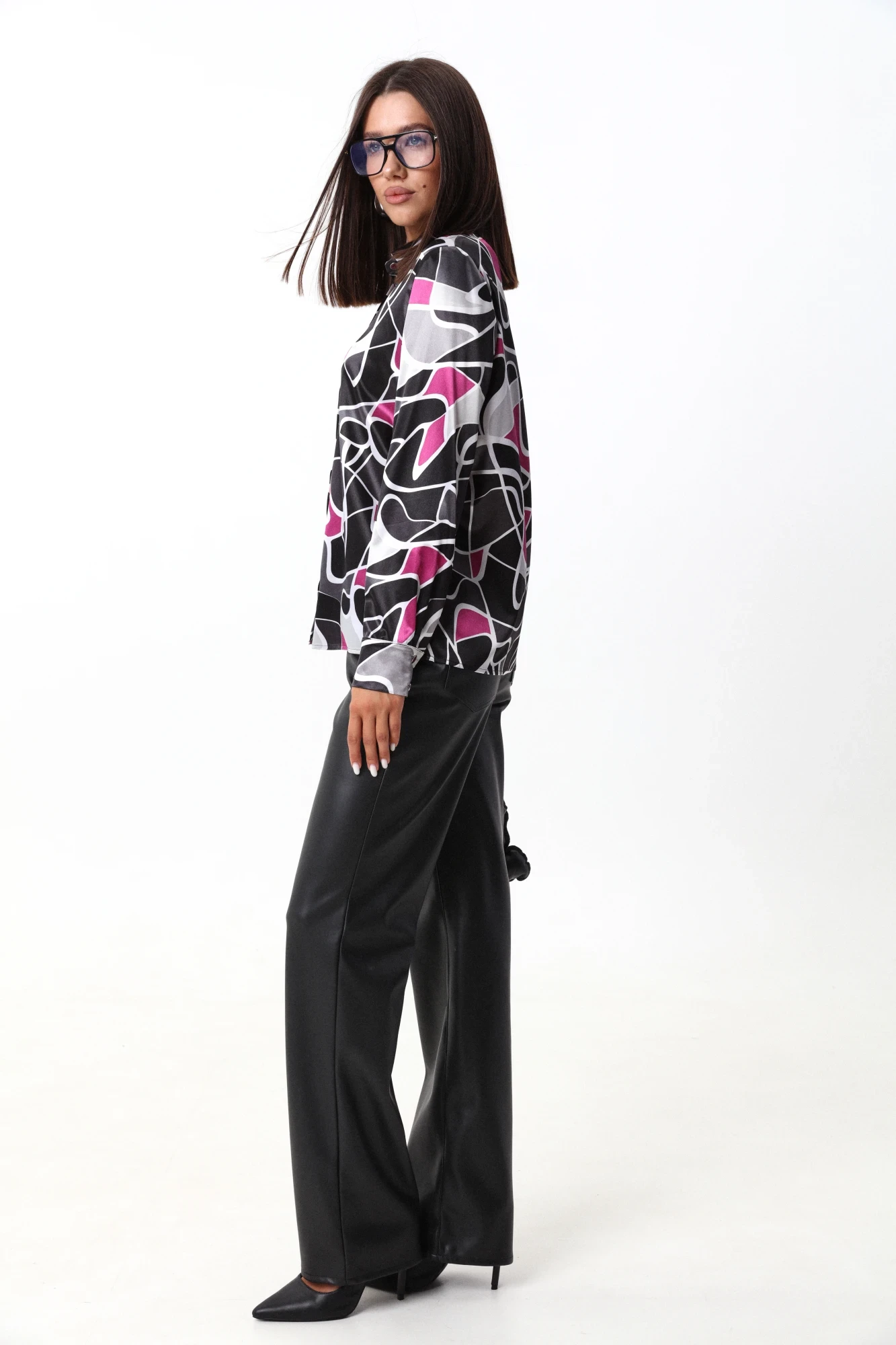 Блузка прямого силуэта с оригинальным принтом из лёгкой ткани с атласным мягким блеском. Воротник рубашечного типа, застежка на прорезные петли и пуговицы. В нижней части рукава заложены складки, манжета на двух пуговицах. Фурнитура и материалы отделки могут незначительно отличаться от тех, что на фотографии. Рост фотомодели 175 см. Размер у фотомодели – 44.