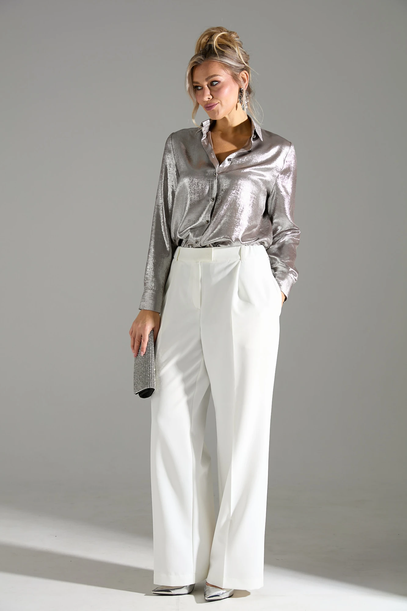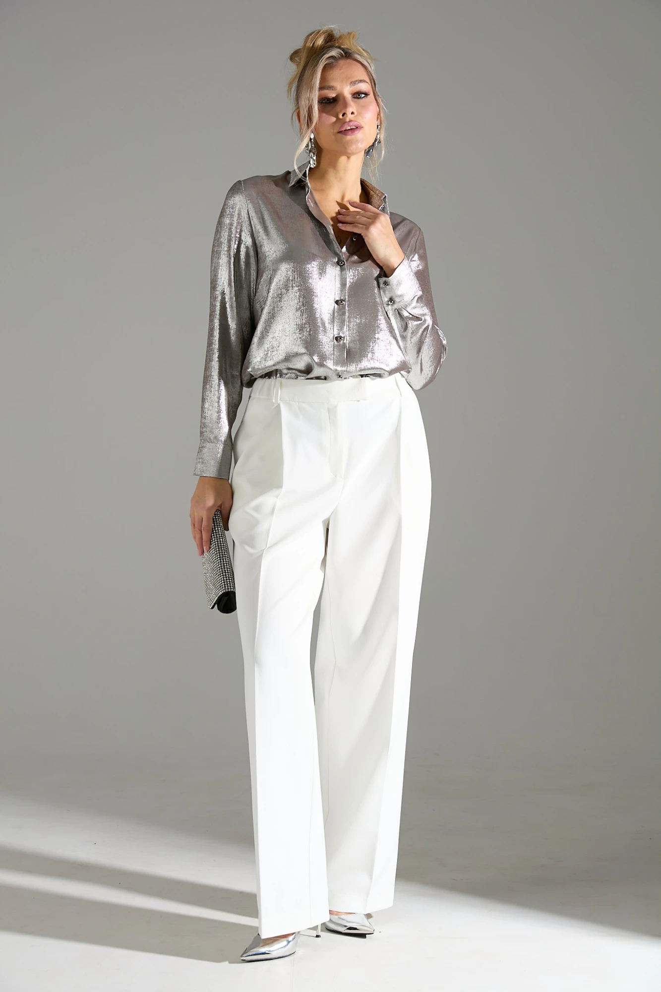Блузка прямого силуэта из ткани с приятной к телу ткани с вискозной изнанкой и блестящей лицевой стороной. Воротник рубашечного типа, застежка на прорезные петли и пуговицы. В нижней части рукава заложены складки, манжета на двух пуговицах.