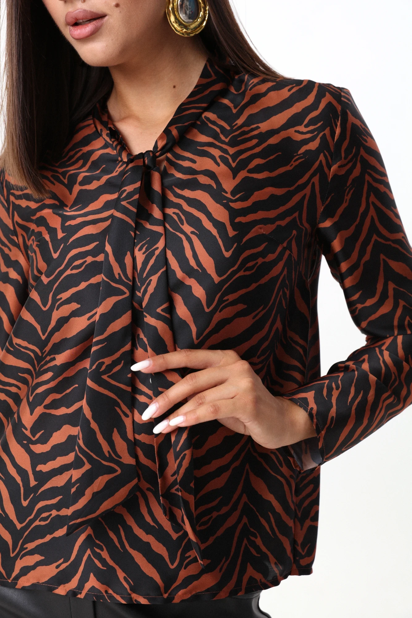 Элегантная блуза из плотной струящейся ткани с атласным эффектом объёмного кроя, с декоративными завязками на горловине. По переду блузы прошиты нагрудные вытачки. Манжеты с застёжкой на пуговицу. Рост фотомодели 175 см. Размер у фотомодели – 44.