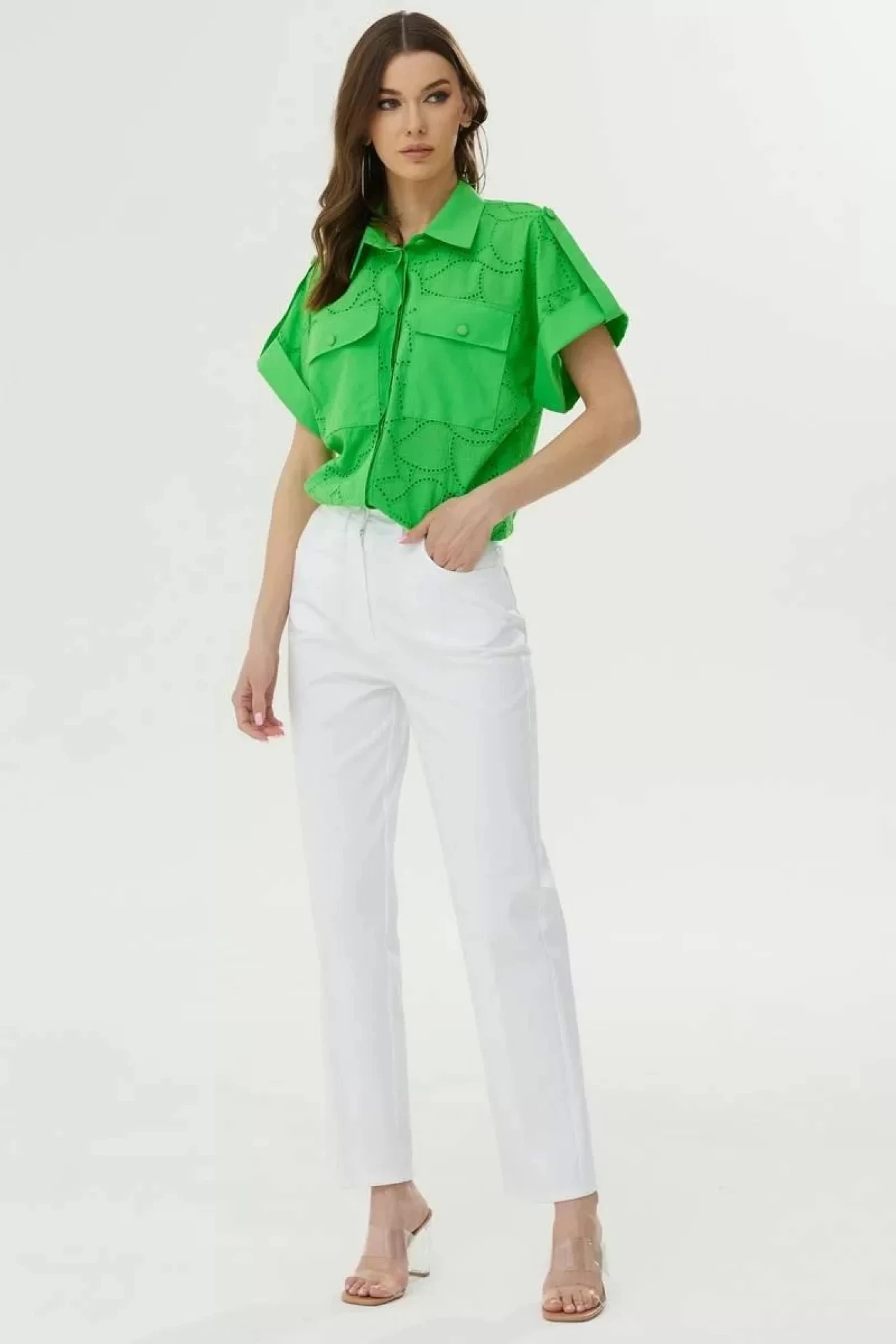 Стильная блузка прямого силуэта из ришелье, комбинированное однотоном, с фигурным низом. Воротник рубашечного типа с супатной(потайной) застежкой на петли и пуговицы. Рукав цельнокроеный, по низу манжета с декоративной патой. Перед с накладными карманами и клапанами. Обращаем ваше внимание на то, что фурнитура может незначительно отличаться от фото.
