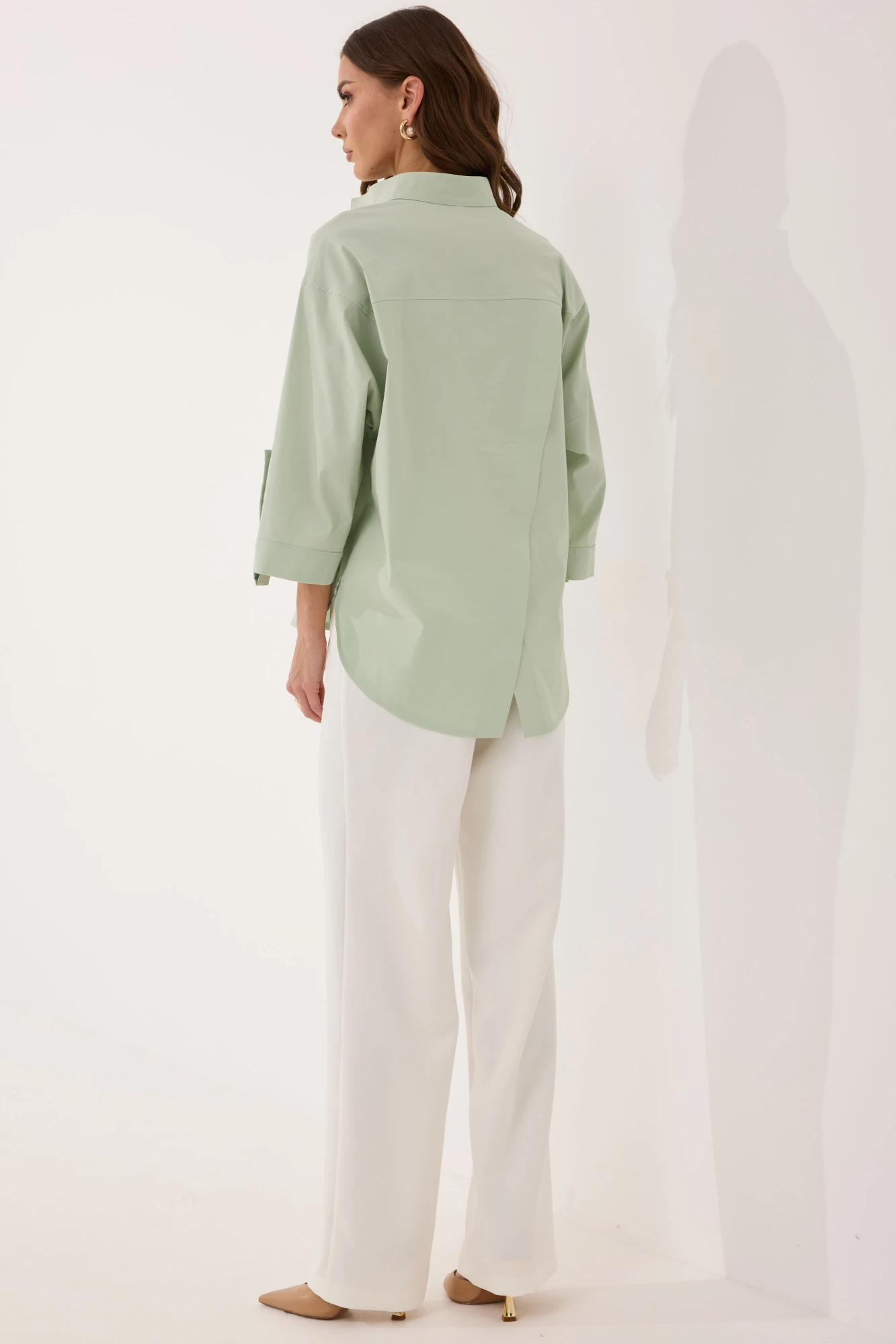 Стильная блузка из хлопковой ткани свободного силуэта с фигурным низом. Воротник - стойка. Перед блузки с притачной планкой с застежкой на петли и контрастные пуговицы. Спинка с кокеткой, нашивной декоративной пластинкой и диагональным срезом, переходящим в разрез понизу. Рукав реглан длиной 3/4, с притачной манжетой с декоративной патой и пуговицами понизу.