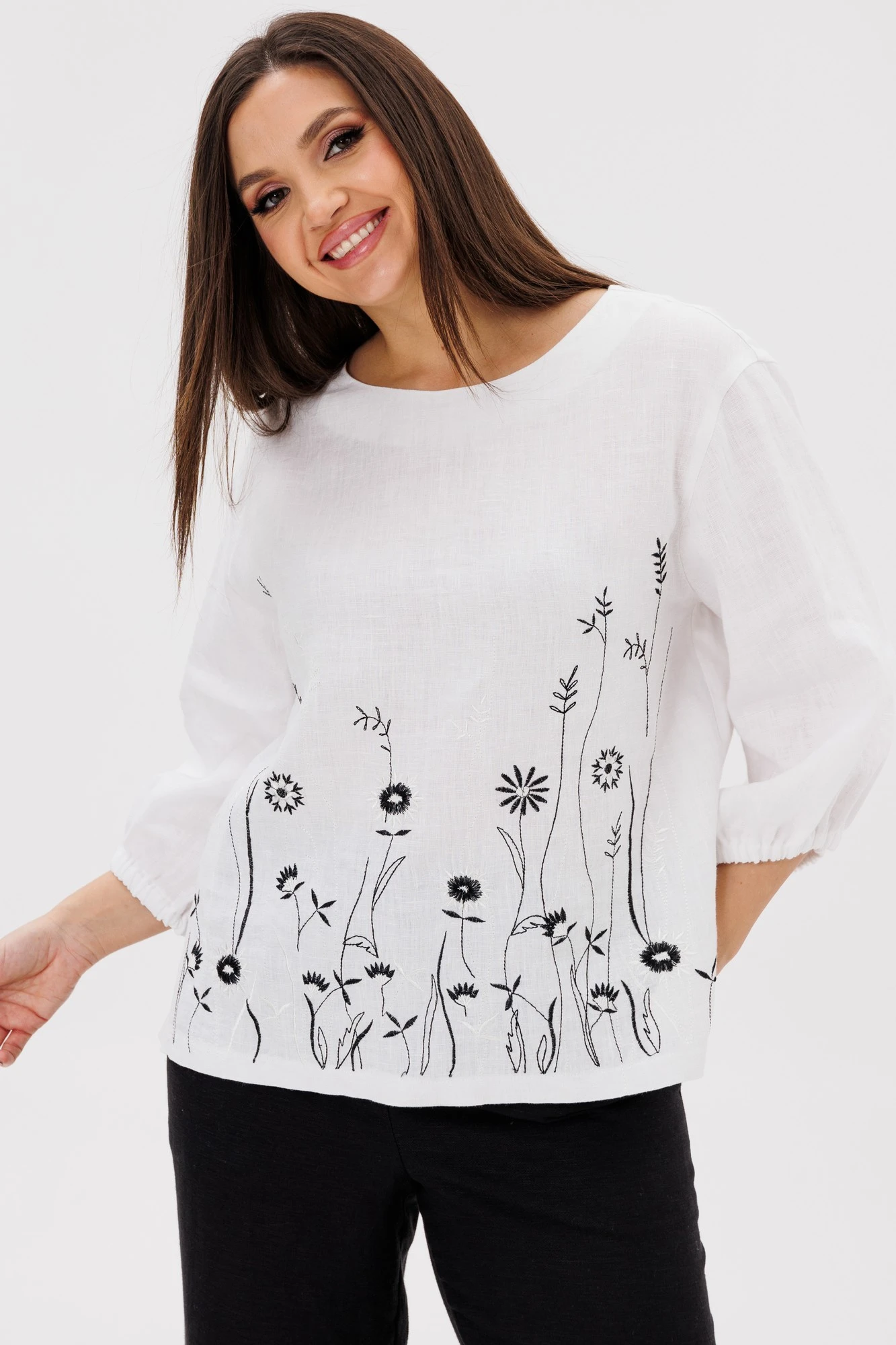 Блуза для повседневного использования. Будет идеально смотреться с нашими льняными брюками 2088 (на фото), также обе модели можно приобрести комплектом 3131."